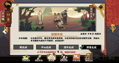 在无悔华夏手游中,渔樵问答是游戏长期更新的福利活动。大家每日都可以参与答题获得奖励,不过如果答错就没啥了。那无悔华夏渔樵问答7月12日答案是什么?下面就和小编一起去看看最新答案吧。  无悔华夏渔樵问答7月12日答案最新分享 7月12日渔樵问答:公元前409年,魏文侯为了保住西河郡,以名将吴起为主将与秦军交锋,吴起以五万魏军大破五十万秦军,此战史称? 正确答案:阴晋之战  答案解析:阴晋之战发生于前389年,秦国起兵50万讨伐魏国西河郡,被郡守吴起以少胜多击败秦军的著名战争。然而,阴晋之战却没有被《史记》及诸多史料所记载,仅在《吴子》一书中所出现,故真实性有争论。 吴起请魏武侯派他率领五万名没有立过功的士兵反击秦军。武侯同意并加派战车五百乘、骑兵三千人。作战前一日,吴起命令三军:“诸吏士当从受敌车骑与徒。若车不得车,骑不得骑,徒不得徒,虽破军皆无功。”。翌日,秦魏两军于阴晋大战,因魏军士气高昂、将士用命,终于以五万魏军打败五十万秦军,成功保住河西。 无悔华夏渔樵问答7月12日答案是什么?无悔华夏渔樵问答7月12日答案最新分享炊烟化险为夷鸟语花香四起18. 愿我的生命也是这样的,没有大多绚丽的春花、没有太多飘浮夏云、没有喧哗、没有旋转的五彩,只有一片安静纯朴的白色,只有成熟生命的深沉与严肃,只有梦,像一样红枫那样热切殷实的梦。(2)比较级+and+比较级(The world is getting smaller and smaller.)74.天将降大任于是人也,必先苦其心志,劳其筋骨,饿其体肤,空乏其身,行拂乱其所为,所以动心忍性,曾益其所不能。 一叶兰舟,便凭急桨凌波去。贪行色、岂知离绪,万般方寸,但饮恨、脉脉同谁语?更回首、重城不见,寒江天外,隐隐两三烟树。102李白:送友人无悔华夏渔樵问答7月12日答案7.A fall into the pit,a gain in your wit. 吃一堑,长一智。 |