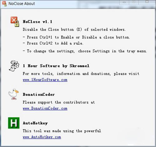 在日常使用电脑时,打开的窗口多了难免会出现误关窗口这样的情况,还没看就误关的网页,甚至还没保存的文档,确实让人烦心。其实,我们完全可以避免这样的情况,小编在这里给大家推荐一款不错的防电脑窗口误关小工具—NoClose。 NoClose理解起来很通俗,就是不关闭的意思,其原理就是将原设置的单手关闭改为双手关闭,也就是说就是由两只手同时配合才能关闭一个窗口。 具体操作 启动NoClose后,自动驻留系统托盘,这时将弹出对话框告诉我们具体使用方法。Ctrl+1是其中最关键的是一个快捷键!  假如你的电脑桌面上已经打开了很多窗口,为防止误关,你可以通过Ctrl+1对其中一些重要窗口进行锁定。锁定后,这些窗口的右上角关闭按钮将无法关闭窗口,窗口关闭图标将自动转成暗灰色以示区别。如果你想关闭窗口也很简单,左手按下Ctrl+1,右手操作鼠标点击关闭按钮。这样的操7. 真正的爱情是当我们老了,我还是会记得你当初让我心动的样子。作就是为了有效地避免窗口误关。  你也可以在NoClose上设置你常用的快捷键!右击系统托盘图标选择“Settings”,将鼠标移动到“Hotkey to Enable/Disable the active windows\'s close button”键入新的快捷键即可。而且它还有几个特别的设置,比如你可以让软件或系统启动时自动禁用关闭按钮,还有一个设置是控制NoClose退出时是否恢复关闭按钮,根据你自己的需求来设置。 但美中不足的是NoClose是英文版的,且对Office、QQ这样一些窗口是不起作用的,但是NoClose对用户网页、文档之类的窗口效果还是挺好的,我们一起期待NoClose的成长吧! 误关电脑窗口怎么办,NoClose防电脑窗口误关小工具春肝琳琅满目胆相照花秋月1. 你看,这一树闪光的、盛开的紫荆,花朵儿一串接着一串,一朵接着一朵,彼此推着挤着,好不活泼热闹。乱扔垃圾使我们的学校脏乱,并且有损学校的形象。69.战无不胜,攻无不克。 街南绿树春饶絮,雪满游春路。树头花艳杂娇云,树底人家朱户。北楼闲上,疏帘高卷,直见街南树。白狼河北音书断,丹凤城南秋夜长。电脑,窗口47、East or west, home is the best. |
