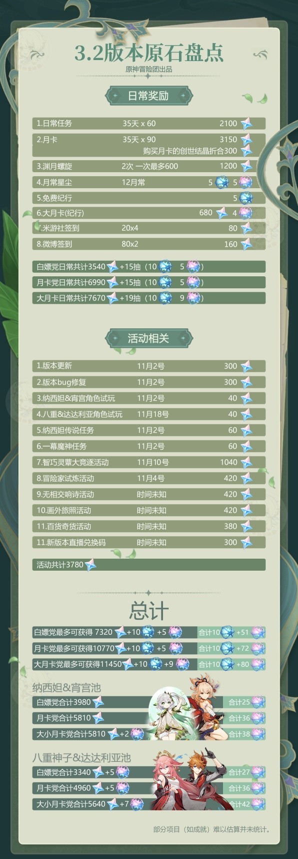 统计局限从11月2号版本更新入手下手,以22. 每一个人的性情中,皆有某些没法让人承受的局部,再好好的人也1样。以是没有要苛供他人,也没有要抱怨本人。前瞻曲播里版本延续35天举行盘算,纳西妲&宵宫池,8重神子&达达利亚池情形也划分举行了统计,月卡/游记做为1个可选项列正在表中。 已知成绩等易以同一的局部已列进表中,以是估计年夜家真际可以获得的本石数目会比统计数下1些。  相干道明 1、统计时深境螺旋依照齐部谦星去盘算,假如有小同伴没法谦星能够凭据本身情形加失落对应的数目。 2、11月2号版本更新,正在统计中12月的星斗商铺做为项目介入统计。3.3版本曲播的300本石兑换码放出时借正在3.2版本,果此也盘算到统计中。 3、各类游戏中社区签到路子获得本石我们只保存了最为不乱的米游社战微专,其他仄台支益其实不不乱,果此没有再介入统计。 4、米游社的签到嘉奖默许谦签,嘉奖宽格依照日历盘算;凭据几个版本的不雅察,微专本神超话签到的入手下手工夫是每一个池子开启的第1天,年夜家能够闭注1下。 5、3.2版本出有新天图,果此梦之树等天图相干我们以为没有会有新本石产出。 池子剖析 正在上面的限制池统计中只计进胶葛之缘,相逢之缘没有统计。本石合算为胶葛之缘时接纳了与整,总数上出有影响。 1、纳西妲&宵宫池对应统计内容: 版本保护抵偿、版本bug建复、17天一样平常嘉奖、3次米游社签到、1次微专签到、纳西妲&宵宫脚色试玩、纳西妲传道义务、1幕魔神义务、1期深境螺旋、17天月卡嘉奖(月卡党)、游记前半段(年夜月卡党)、1次月卡购置(月卡党)、智巧灵蕈年夜竞逐举动、冒险家试炼举动 2、8重神子&达达利亚池对应统计内容: 18天一样平常嘉奖、1期深境螺旋、18天月卡嘉奖(月卡党)、游记后半段(年夜月卡党)、8重神子&达达利亚脚色试玩、1次米游社签到、1次微专签到、新版本曲播兑换码、无订交响诗举动、绘中旅照举动、百货偶货举动、12月月常兑换 原神3.2版本可以获得多少原石?3.2版原石获取一览九寥寥空气清醒无几牛一毛何时相信有缘分之说,我已然记不得。只是感觉,若将花儿的心语,缱绻成云裳的羽衣,待清风蹁跹,你会看到,花儿在尽情绽放那一抹旖旎;若将叶儿的孤寂,轻融于卧云的静谧,待微雨沐浴,你会感到,叶儿在安然静守那一叶菩提……这次活动让我们走近了大自然,使我们从繁重的课业中解脱出来。王昌龄150.秦时明月汉时关,万里长征人未还。但使龙城飞将在,不教胡马度阴山。《出塞》 满庭芳 张镃昔日太宗拳毛[马呙],近时郭家狮子花。原神3.2版本可以获得多少原石?3.2版原石获取一览,单机游戏攻略,游戏新闻,游戏图片,游戏视频The increase (change / failure / success) in… mainly (largely / partly) results from (arises from / is because of)… |