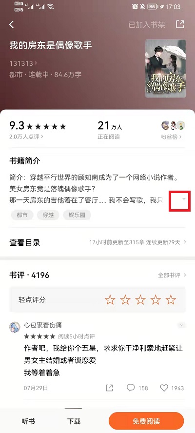 番茄小说中,所有小说第一眼看到的都是小说的内容,很多用户都想要看书的简介,对于加入书架的书来说,是比较好奇书的介绍的,所以想要知道番茄小说加入书架的书怎么看简介?那么下面就让小编给大家介绍一下。 1、打开番茄小说进入到小说的书架界面中,然后点击一本想要查看简介的小说;  2、然后在界面中,点击中间位置,调出功能界面,然后点击右上角的【...】; 31. 恋情是生命的全部,失恋是恋爱的前提,她会让我心动,但不会让我死心,我要好好的活下去,前面有更好的风景。 3、然后在弹出的功能选项中,点击【书籍详情】;  4、然后就会跳转到书记详情界面,就可以看到小说的简介。 番茄小说加入书架的书怎么看简介青春意盎然翠人声鼎沸欲滴15. 那是高山春雪初融,化为溪涧游走峡谷,一路行来,只见水珠迸射,阳光烁金,时有桃花成文,或遇云影结上了荇藻。在我看来,你结束留学后应该回国。209.千淘万漉虽辛苦,吹尽狂沙始到金。《浪淘沙》 情怀渐觉成衰晚,鸾镜朱颜惊暗换。昔年多病厌芳尊,今日芳尊惟恐浅。云髻罢梳还对镜,罗衣欲换更添香。手机软件22、Youth will be served. |
