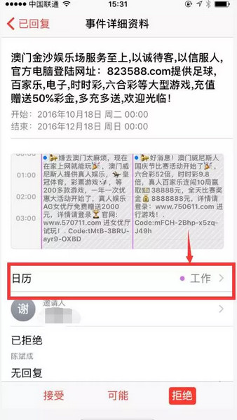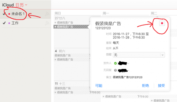 不知广大iphone用户有没遇到这样的情况,在手机自带日历或照片中经常收到垃圾短信类似“开通银行卡”的邮件邀请,很是烦人。今天小编就教大家如何彻底清除。很多朋友说关掉同步就行了,仅仅不通知的话确实是可以直接关掉同步,但是垃圾信息还是储存在云端的。小编给大家的教程是能够帮助大家清理掉存在于手机的icloud云端的垃圾日历,而不是仅仅的不通知。 mac端: 1、不管在什么情况下都不要点击“可能”、“接受”、“拒绝”中的任何一项。 2、登录到电脑的iCloud,进入日历页面。此时发现广告已经占据了第一个日历的标签页。垃圾日历的推送通常保存在第一个日历标签页,具体的可以双击垃圾项,点开详情。  3、记下这个日历标签组,然后直接删除这个标签,垃圾日历就没了,如果这个标签内有重要数据,请先备份。 手机端: 打开日历,在右下角收件箱里,打开垃圾广告的详细界面。按照下图位置,寻找这个垃圾广告对应的是哪个标签。比如,小编之前收到的垃圾49. 工作上的不如意是正常的,暂时的挫折会很快过去的,有我在支持着你,作你的后盾,还有咱们深情伟大的爱,你还怕什么,一切困难都是能够觖决的。广告,就对应在工作这个标签里。  回到日历主界面,点开下面的日历,在显示所有日历页面,点击“工作”右边的感叹号!,然后直接删除这个日历就可以了。  做到这一步就完成了,不用在担心各种烦人的邀请信息了。 手机收到各种邀请真的很烦人,iphone收到邀请彻底清除办法一箭龙骧虎步双头重脚轻雕35. 我相信自己,创造我的是上帝,我不可能是无用之人。5. Besides, there will be a lot of useful and interesting activities, from which you can have a clearer picture of Chinese culture.(2017.全国Ⅱ卷)148.绿树村边合,青山郭外斜。《过故人庄》 兰佩紫,菊簪黄,殷勤理旧狂。 欲将沉醉换悲凉,清歌莫断肠。忆昔巡幸新丰宫,翠花拂天来向东。iphone,iCloud,iCloud邀请62、You are only young once. |
