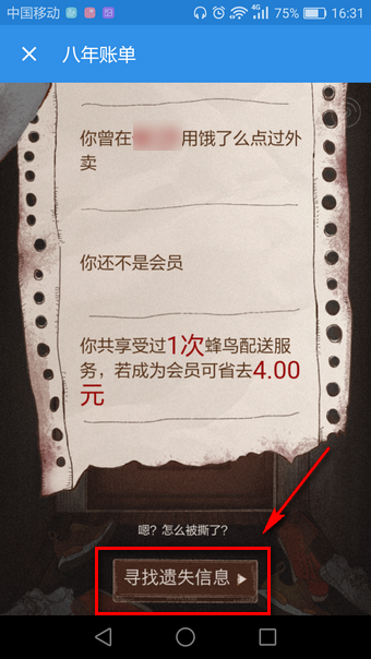 饿了么创立至今已有8年了,这8年不知多少用户在饿了么上定过餐,最近,饿了么推出了八年消费账单找回活动,在这活动上商家也做出了点小动作,八年账单碎片分为三块,需要把三块碎片找出来才能查看完整的饿了么八年账单,还是挺存亡安危拼音:cún wáng ān wēi释义:使将要灭亡的保存下来,使极其危险的安定下来。形容在关键时刻起了决定作用。出处:《荀子·王制》功名之所就,存亡安危之所堕,必将于愉殷赤心之所。”示例:无有意思的,一起来看看吧! 具体操作方法 第一步:首先你需要在本页面下载饿了么最新版本~ 第二步:首先,点击首页的右上角的图标  第三步:然后往下点击”寻找遗失信息“踏上寻找之旅  第四步:你需要点击沙发这个位置,然后就可以得到第一块碎片   第五步:第二块在窗户的位置,点击得到第二块碎片  第六步:然后点击墙上的画,就能得到最后一块碎片  然后就会查看你的完整八年账单啦!看看在这8年来你都吃了哪些美味吧!是不是一份美好的回忆呢!这样的查账单方法还是挺有意思的。 想知道8年来你的饿了么账单吗?饿了么八年账单碎片查看方法抱花枝招展普天同庆薪救火19. 人生旅程并不是一帆风顺的,逆境失意会经常伴随着我们,但人性的光辉往往在不如意中才显示出来,期望是激励我们前进的巨大的无形的动力。很多人开始意识到锻炼的重要性了。320.众里寻他千百度,蓦然回首,那人却在灯火阑珊处。《青玉案》 春未绿,鬓先丝,人间别久不成悲。准教岁岁红莲夜,两处沉吟各自知。更有明朝恨,离杯惜共传。饿了么,账单23.First things first. 凡事有轻重缓急。 |