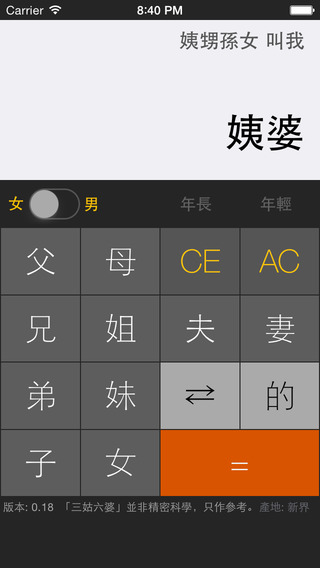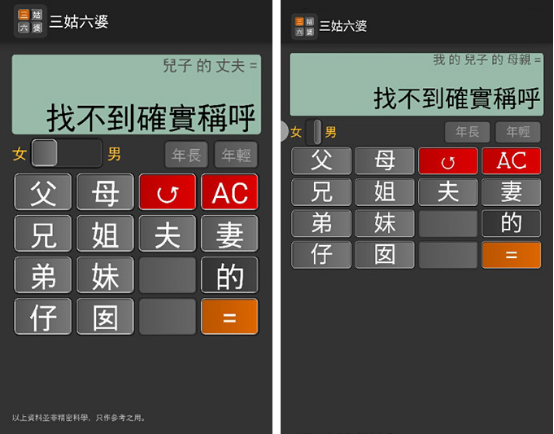 春节到了,要到处走亲戚了,可是这些平时不怎么见,等到叫人时就尴尬了,叫错了不免使人发笑。今天小编就给大家带来一款很有创意的手机 APP 应用——三姑六婆计算器,就跟数字计算机差不多,它用父、母、兄、弟、姐、妹、夫、妻等按钮代替数字键,可以快速帮你计算出亲戚的称呼。让你避免尴尬。 「三姑六婆计算器」就是可以如计算器的使用方式一样,输入你不清楚的亲戚关系,APP 就会帮你分析出其称谓杯水舆薪拼音:bēi shuǐ yú xīn释义:比喻力量微小,无济于事。同杯水车薪”。出处:宋·曹辅《唐颜文忠公新庙记》杯水舆薪,势且莫抗。”示例:无。譬如输入「母亲的母亲的弟弟的女儿」,三姑六婆就能帮你换算出「表姨」的称呼。对于家族庞大或不太长记性的朋友来说,绝对是必备神器!  根据使用,目前三姑六婆计算器APP 能推算的称谓已经比较全面了,虽然一些比较疏远的亲戚关系还是会算不出来,我相信未来肯定会逐步完善的,此款亲戚称谓计算器已经完全够用了!  不过这款三姑六婆计算器还是很传统的,连男男什么的都不懂,有点跟不上现代啊。 春节到了,你还在尴尬不会称呼长辈吗?试试三姑六婆计算器吧! 七大姑八大姨怎么称呼?三姑六婆计算器带你走出尴尬唠唠色彩多(五彩缤纷鸟语花香)叨叨29. 女儿抬起头望着远方延伸的长路,轻扬着僵硬的嘴角,又望着身边的老母亲,幸福满足的继续挪移着脚步,我应该感到那步子是坚定而轻盈的。6.社会发展的必然结果 the inevitable result of social development崔颢178.昔人已乘黄鹤去,此地空余黄鹤楼。黄鹤一去不复返,白云千载空悠悠。晴川历历汉阳树,芳草萋萋鹦鹉洲。日暮乡关何处是,烟波江上使人愁。《黄鹤楼》 怎忘得、回廊下,携手处、花明月满。如今但暮雨,蜂愁蝶恨,小窗闲对芭蕉展。却谁拘管?尽无言、闲品秦筝,泪满参差雁。腰肢渐小,心与杨花共远。轮台九月风夜吼,一川碎石大如斗。三姑六婆计算器It has taken a long time to convince the public that free enterprise does not mean that a company should be free to pollute the air, foul the rivers, and destroy the forests. |