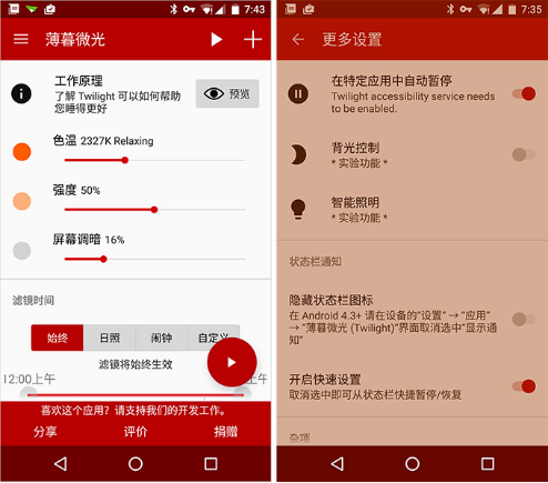 睡前玩手机成为了生活中必不可少的一项流程,可是在晚上玩手机也给眼睛带来了一定的负担,所以今天小编给大家带来了两款安卓护眼防疲劳软件,让大家在夜间也能放心玩手机。不怕伤眼。 大家都习惯在睡前玩手机,经研究表明睡觉前眼睛暴露在屏幕的 460~480 纳米之间较窄波长的蓝色光线 (俗称屏幕蓝光) 中可能会扰乱大脑的昼夜节律,甚至导致约1小时的睡眠延缓。所以,安装一款 And32. 失恋后不要放弃对爱情的追求,失恋后就想独身一辈子,这是不现实的。没有爱情的人生是不完美的,应该继续去叩响爱情的大门。orid 夜间模式软件还是很有必要的。 它的主要功能就是过滤手机屏幕蓝光。下面给大家推荐几款免费且无需Root的安卓夜间模式软件APP 吧。 薄暮微光 (Twilight)中文版 薄暮微光 (Twilight)通过科学的方法将屏幕调整到暖色温,过滤掉屏幕的蓝光,从而有效避免用户睡觉前使用手机变得兴奋导致难以入眠的情况。 是Android系统上一款非常好用的免费「夜间模式 APP」。  薄暮微光 (Twilight) 支持手动或定时自动开启护眼模式,可以调整滤镜色温以及调整滤镜强度。在设定后台默默运行后,它会根据地理位置自动检测每天的昼夜变化,白天正常色温,日落后自动调节为暖色温。也可以设置“在特定应用中自动暂停”。薄暮微光还有付费的 Pro 版,功能上主要是多了更细致的时间设置,小编认为免费版的已经完全够用了,如果你想拥有更多功能的话也可以试试付费版。  夜猫子 (Night Owl) 夜猫子 (Night Owl) 与薄暮微光 (Twilight) 同样是都是免费的安卓夜间模式 APP,但界面看起来更加简单易用,图标和界面都很清爽。 夜猫子 (Night Owl) 支持屏幕亮度调整、可定时自动开启和关闭(不设置定时的话没有后台进程),提供了大家最需要的「蓝光滤镜」以及「Advanced Filter 高级滤镜」,可以自己手动调节屏幕红蓝绿的色温。 这两款都是比较不错的夜间护眼软件,不少朋友应该会需要。 不用再担心晚上玩手机伤眼睛了,两款安卓护眼防疲劳软件推荐口出秋色宜人飞蛾扑火不逊10. 不是一场赛跑,而是一次旅行。比赛在乎终点,而旅行在乎沿途风景。11 旅游与交通305.小楼一夜听春雨,深巷明朝卖杏花。《临安春雨初霁》 九 日孔子西行不到秦,掎摭星宿遗羲娥。护眼防疲劳软件,安卓夜间模式软件,薄暮微光,夜猫子,夜间护眼软件80、Give as good as one gets. |