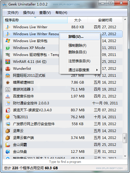 很多用户都有软件卸载不彻底的经历,造成磁盘内堆满垃圾,拖慢电脑速度。今天小编为大家介绍的是一款很有特色的单文件绿色软件彻底卸载工具:小巧灵敏,体积不到2M,完全免费,支持多国语言,原生支持32位与64位系统,你不需要安装即可直接卸载软件、强制彻底清除软件残留垃圾文件或是查看某软件的注册表项目等等,轻松还你一个干净高效的系统。  GeekUninstaller 支持 Windows7/XP/Vista/2003/2008,最新的 Windows8 也没问题。它的界面非常简单,就一个已安装软件的列表,右键点击软件,即可进行相应的操作15. 东西虽然丢了,就算它再珍贵又有何防,毕竟咱人是好好的,懂吗?这叫“留着青山在,不怕没柴烧”。希望这件事情不会再影响到你的心情。,如卸载、强制卸载、删除条目、注册条目、安装文件夹、程序网站和通过谷歌搜索软件相关信息,基本上也不需要我过多的描述了。 GeekUninstaller 这种单文件绿色的卸载工具可以帮助大家解决文件卸载不彻底的问题。 精致小巧的单文件绿色软件彻底卸载工具——GeekUninstaller成人之应有尽有美百孔千疮38. 青春乃心境,而非年华;青春非现于桃面朱唇之艳,灵活矫健之躯,而现于志士之气,遐想之境,激情之盛。生命之泉,涓涌不息,青春常绿。take pains to do sth 努力 / 下苦功做某事;get / be prepared for 为……作好准备362.好事不出门,恶事传千里。 二十馀年如一梦,此身虽在堪惊,头登小阁看新晴。古今多少事,渔唱起三更。蕃汉断消息,死生长别离。GeekUninstaller,卸载工具75、The heart is seen in wine. |