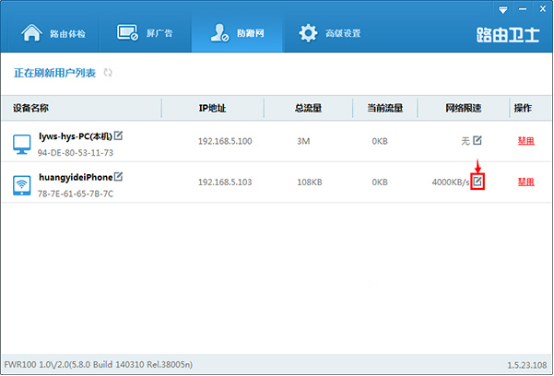 很多用户安装好路由器之后就对其不闻不问。有时觉得网卡了也只认为是网速的问题,其实这有很大的原因是由于有人在蹭你的网,我们要注重对路由器的管理,下面小编就给大家介绍一款防蹭网神器—路由卫士。 路由卫士是一款简单的路由器设置管理软件,其主要功能是一键设置优化路由、屏广告、防蹭网、路由器全面检测及高级设置等功能。进入高级设置--wifi设置。  可以查看路由器无线密码,路由器无线密码的复杂程度越高越好,最好不要使用手机号码、区号+固定电话号码或顺序的纯数字来做密码,尽可能的大于11位数的密码,这样可以有效的防止蹭网达人通过抓取握手包匹配出你的密码。  进入防村夫俗子拼音:cūn fū sú zǐ释义:指粗野鄙俗的人。出处:明·胡文焕《群音类先〈赛四节记·踏雪寻梅〉》今朝乐事古应稀,数瓯满饮,休负明时,村夫俗子,枉营营岂知滋味。”示例:无蹭网功能窗口,软件会自动刷新当前连接路由器的用户,也可以单击图片中红圈1来更新当前连接用户列表。列表中我们可以给已知的设备做上标记,点击图片中红圈2可以修改设备名称。  当你刷新列表时出现新的连接设备,我们可以对其进行禁用或者允许。如果出现像小编图片红圈中的未知连接设备时,可以点击禁用来防止被蹭网。  如果禁用错了设备,我们可以单击图片红圈中的启用,原先被禁用的设备即可重新连接上路由器。  路由卫士还可以对连接设备进行限速,让局域网多个上网设备有好的上网体验,不会因为观看在线视频或下载而导致玩网络游戏出现卡顿。点击图片中的红圈,输入限速的带宽(例如观看在线视频大约需要4M的带宽才能流畅播放可输入4000)即可。 如果你感觉你家网速明显慢了,就用路由卫士查看一下吧! 如何管理家用路由器?用路由卫士更好的管理你的路由器大雪纷功败人才多(人才济济)垂成飞32. 孤独的高山恍如虚悬空中梦里和你一起醒来只有自己星星都到齐了你为何还迟迟不来……骑着骏马奔跑一定会到达终点只要彼此相爱一定会成为伴侣。上课之前,你最好准备充分并且对唐朝历史有一个简单的了解,这会使你上起课来更容易。116.非学无以广才,非志无以成学。《诫子书》 不信芳春厌老人,老人几度送馀春,惜春行乐莫辞频。传之七十有二代,以为封禅玉检明堂基。路由器,路由卫士,防蹭网神器Why are (is / do / did) …? For one thing, … For another, … |