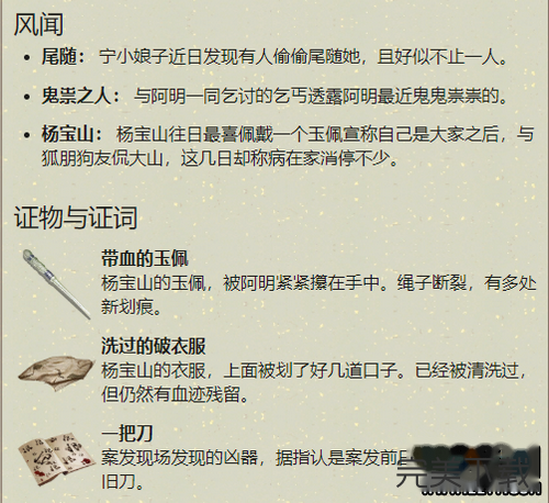 天涯明月刀杨宝山案证物怎么选择呢,有什么玩法攻略呢,还不清楚的小伙伴们快来看看这篇关于天涯明月刀杨宝山案证物选择攻略,希望大家喜欢。 天涯明月刀杨宝山案证物选择攻略  一、案件情况 这段时日常有人尾随城中少女,更有乞丐惨遭毒打横死街头,一时间人心惶惶,不知是何方恶人作案.... 二、提交证物答案 带血的玉佩 三、证物 带血的玉佩 洗过的破衣服 一把刀 四、犯人40. 抱怨是一种致命的消极心态,一旦自己的抱怨成为恶习,那么人生就会暗无天日,不仅自己好心境全无,而且别人跟着也倒霉。抱怨没有好处,乐观才最重要。 杨宝山(男) 五、罪行 杨宝山被指证谋害乞丐阿明,以隐瞒自己意图对宁小娘子不轨的罪行。  六、案件解析 1、小包拯提供了三个证物:带血的玉佩、洗过的破衣服、以及一把刀; 2、案发现场的玉佩是杨宝山的祖传玉佩,多种划痕,绳子断裂; 3、杨宝山平时爱惜玉佩,如今这幅样子,就是因为玉佩到了阿明的手中; 4、阿明的朋友也说杨宝山日日尾随小娘子,阿明欲阻挠,才被杀死。 以上就是天涯明月刀杨宝山案证物选择攻略,希望大家喜欢,更多内容敬请关注完美下载网。 -