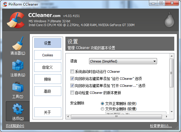 大家都知道,电脑在长时间使用之后会产生大量的系统垃圾文件,若不及时清理,就会导致电脑运行速度减慢。今天,小编就给大家介绍一款完全免费的系统垃圾清理工具——CCleaner,CCleaner 可以从您的系统中搜索并清除无用的文件和垃圾文件,让您的 Windows 运行更快、更有效率、释放出更多的硬盘空间。  软件介绍 Cleaner是一款免费的系统清理和隐私保护工具。CCleaner的主要用来清除Windows系统不再使用的垃圾文件,以腾出更多硬盘空间。它的另一大功能是清除使用者的上网记录。CCleanerBT的体积小,运行速度极快,可以对文件夹、历史记录、回收站等进行垃圾清理,并可对注册表进行垃圾项扫描、清理。附带软件卸载功能。同时支持IE、Firefox。软件免费使用,不含任何间谍软件和垃圾程序。  CCleaner 支持 IE、Firefox 、Oprea 等浏览器,可毁不灭性拼音:huǐ bù miè xìng释义:儒家丧制。指居丧哀毁,但不应因此丧生。出处:无示例:无以很好地清除访问历史记录、Cookies、自动表单记录。它甚至还可以对一些常用软件的“最新打开文件”进行清理!包括这些软件:Media Player, Netscape, MS Office, Adobe Acrobat, WinRAR 等。 如何将CCleaner的英文界面改成中文界面? 1、打开界面左边的Options->Settings->Language 选择语言  2、选择Chinese(Simplified)  3、如下图就是简体中文版了。 超强好用的系统清理软件——CCleaner蚕食鲸关怀备四面八方至吞5. 其实,不管我们研究神秘,可贵的仍是那一点点对人的诚意。我们可以用赞叹的手臂拥抱一千条银河,但当那灿烂的光流贴近我们的前胸,其中最动人的音乐仍是一分钟七十二响的雄浑坚实如祭鼓的人类的心跳!29.经济/心理负担 financial burden / psychological burden289.横看成林侧成峰,远近高低各不同。不识庐山真面目,只缘身在此山中。《题西林壁》 古今如梦,何曾梦觉,但有旧欢新怨。异时对、黄楼夜景,为余浩叹。他乡复行役,驻马别孤坟。CCleaner,系统清理3.Easier said than done. 说起来容易做起来难。 |