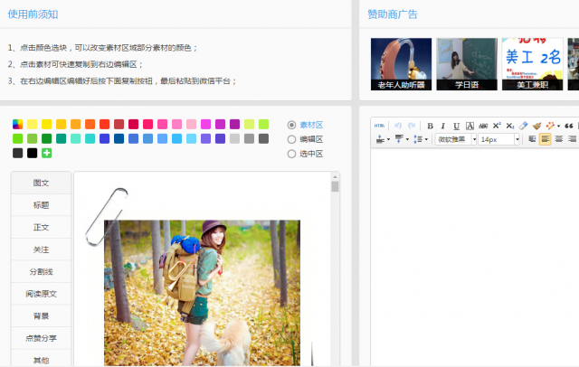 随着微信的普及和广泛使用,很多人都会用微信进行营销,要想在公众平台上发一篇图文并茂、吸引人的文章,那么一款专业好用的图文编辑器是必不可少的,接下来小编就为大家介绍一款图文编辑软件——易点微信编辑器,一起来了解下吧。 易点微信编辑器软件介绍 易点微信编辑器是山西派唯网络科技有限公司旗下产品,是目前网络上使用较多的一款免费的微信营销的图文编辑软件,可以进行微信里文章的编辑操作。易点微信编辑器操作简单易用,支持修改文章布局排版、线条和字体修改等功能,还可以插图片、加入超连接等等,功能十分强大。  使用步骤 1、在页面的“素材选择区”选择所需的素材; 2、选好素材后,在页面的“素材调整区”调整素材的颜色(部分元素因特殊原因不能调整); 3、选好后,在“素材调整区”按Ctrl+A全选,然后Ctrl+C复制,到“编辑区”按Ctrl+V粘贴; 4、最后到“编辑区”完成文案的编辑,再整体复制到微信官方编辑器中;  软件特色 1、快捷键: F1(ctrl+C)复制 ,F2(ctrl+v)粘贴,F3(ctrl+a ctrl+c)全选复制。 2、请在正文中插入模板统一的替换标志符。 3、模板不限制格式,有提供默认的各种样式,也可以从其他网站复制,粘入模板,保存后下次即能使用。 4、所见即所得,方便进行微信公众号的图文编辑。 内容编辑区常用控件介绍  1、HTML代码模式和普通模式切换; 2、设字体为粗体(对应代码:<strong>...</strong>) 3、清除格式:可清除所选内容原有格式 4、格式刷:可复制所选内容格式到新内容 5、自动排版:可按照自定义格式自动排版所选内容 6、设置字体颜色(对应代码:color: rgb(xxx, xxx, xxx);) 7、设置字体背景色(对应代码:background-color: rgb(xxx, xxx, xxx);) 8、全屏编辑模式 9、设置字体样式(对应代码:font-family: xxx;) 10、设置字体大小(对应代码:font-size: xxx;) 11、设置内容段落格式为“首行缩进”(对应代码:text-indent: 2em;) 12、将所选内容设置为“居左对齐”(对应代码:text-align: left;) 13、将所选内容设置为“居中对齐”(对应代码:text-align: center;) 14、将所选内容设置为“居右对齐”(对应代码:text-align: right;) 15、在光标所在位置插入分割线(对应代码:<hr>) 16、在光标所在位置插入特殊符号 17、在光标所在位置插入表格(对应代码:<table>...</table>) 18、预览页面内容 19、如误将编辑器关闭,可村野匹夫拼音:cūn yě pǐ fū释义:村野荒村山野。匹夫平民百姓。旧指没有知识、没有地位的人。出处:明·罗贯中《三国演义》第六十五回马超曰‘吾家屡世公侯,岂识村野匹夫。’”示例:无找回关闭前内容 易点微信编辑器怎么样?易点微信编辑器使用介绍习胸无点墨惯成自然人欢马叫生命无需太过执着,阴晴聚散随缘分。人生如旅,有人来亦有人去,有些人只是陪我们走过一程,也有的人会相伴我们走完一生。情若相眷,不语也怜惜;心若不懂,相拥也分离。若,渐渐陌生,就轻简单手;若,流年不散,就抓紧拥有。in advance (of ) 提前 (于……);预先 (于……)228.谁知盘中餐,粒粒皆辛苦。《悯农》 沙上并禽池上暝,云破月来花弄影。重重帘幕密遮灯,风不定,人初静,明月落红应满径。野云万里无城郭,雨雪纷纷连大漠。易点微信编辑器The argument ignores the factors - such as initiative, creativity, technical skills, and business judgment - that may be more important than the choice of medium in determining success in photography. |