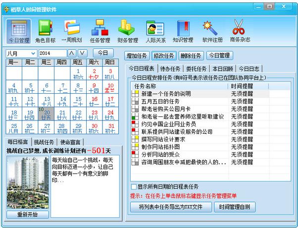 在如今快节奏的社会生活中,时间就是金钱,做好时间规划对于我们的学习工作来说是必不可少的,一个好的时间规划可以帮助管理你的日程生活和工作方面的事情。时间管理软件可以在约会、会议、事件等等做出闹钟提醒,能够方便管理安排工作、日常事务和提醒备忘事项,使工作更加有效率。目前网上的时间管理软件种类多样,究竟哪款好用呢?在此,小编为大家介绍几款常用的时间管理软件,一起来看看吧。 1、ManicTime  ManicTime是一款简单而功能强大的时间管理软件。ManicTime能够会在后台静默记录你电脑上的所有操作,然后以图表的格式分析时间使用的情况,让你更了解自我,工作更有效率,生活更有规律,manictime收集到的数据均是存储在本地计算机的数据库中。另外通过manictime,你可以很容易分析出自己是如何使用时间的,除了自己使用之外,如果你是为人父母或者自己是老板的,也可以分析一下孩子或员工平常是怎么用电脑的。 2、Time Note时光笔记  Time Note时光笔记是一款用最简洁的文字最快速地记录每天事件的时间管理记事工具,并可以存储为.tnf文件永远归属个人管理,无需使用网络也能记录事件,更为安全与方便。本软件支持多文件同时打开;支持事件分类创建;支持加密管理以及提供了年月日周等多种查看模式,满足不同的记事需求。适合于工作日志记录,个人记事及家庭备忘。 3、稻草人时间管理软件  稻草人时间管理软件是集融事业规划、时间管理、财务管理和人际管理于一身,帮您建立一个生活和事业的管理中心,稻草人时间管理软件是根据美国头号绩效管理专家斯蒂芬·柯维的《成功人士的七个习惯》和《要事第一》改编的生活和事业管理第四代时间管理软件。软件的界面友好,操作简单,功能非常的强大。 4、imeRecord  时间记录(TimeRecord)是一款能够时刻提醒你各种事务的优秀工具,记录发生的事情和时间,并可用作备忘录和定时关机,可用寸步不让拼音:cùn bù bù ràng释义:连寸步也不让给别人。形容丝毫不肯让步、妥协。出处:清·梁启超《十种德性相反相成义》盖西国政治之基础,在于民权,而民权之巩固由于国民竞争权利寸步不肯稍让,即以人人不拔一毫之心,以自利天下。”示例:无于统计事件的起始时间以及定时提醒。在不少情况下如果你真能做到恪守时间,还真是能剩下不少银子,例如:控制上网时间、开工提醒等等。可以由您设置任何需要定时提醒的事件,软件提供多种提醒模式和提醒频率选择,更预置了常用的事件标题,如 呼叫提醒、出发提醒等。它的备忘录可以记录各种数据或定时提醒,也可以在你一天的学习或工作中统计具体时间和内容。软件自带搜索框,可以很方便搜索感兴趣的各种信息。 时间管理软件哪家强? 4款时间管理软件下载推荐错夕阳西斜六神无主落有致17. 人生象是一碗茶,需细细品味;人生象是一味药,需认真煎熬;人生象是一盘棋,需仔细斟酌。48. As far as I\'m concerned, riding bicycles is a good solution to air pollution. (2011.江西)冯梦龙364.人逢喜事精神爽,月到中秋分外明。《古今小说》 花 犯 吴文英何用别寻方外去,人间亦自有丹丘!时间管理软件As opposed to (Contrary to) widely (commonly/generally) held (accepted) belief (ideas/views), I believe (argue that… |