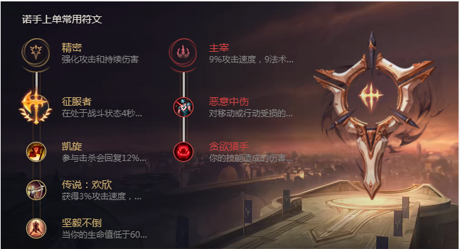 诺手是一个很强的上单英雄,因为其被动的血怒加的攻击力,以及血怒之后的大招伤害,是没有人承受得起的。想要使用诺手上分的小伙伴可不要错过以下的内容哦。  技能加点:主Q副W Q技能有大范围的伤害,并且外圈刮到敌人之后会有回血效果和一层的流血效果,无论是清线还是消耗主Q都是一个很好的选择。W可以重置普攻拥有减速效果可以让自己很快的打出血怒。  出装介绍:三项>水银鞋>血手>振奋>板甲>日炎 20. 几乎所有事情都是两面性的,如只看消极的一面,心情自然会低落、郁闷。让自己换个角度,从积极的一面看待问题吧,那样会让你走出心情低谷的。  推荐符文:主精密附主宰 征服者:伤害的一部分转化为真实伤害,打肉很痛 凯旋:击杀回复生命值 欢欣:加攻速可以很快叠出血怒 恶意中伤:WE都有减速效果 贪欲猎手:会使诺手获得技能吸血  玩法介绍: 前期对线尽量AW起手(AWAEAQ),也可以Q技能起手(QEAWAQ)都很容易打出血怒,当自身血量不多时可以直接使用EQ拉敌人利用Q技能被动回血 打团时要盯着一个人打出血怒之后,就可以直接开着疾跑去切后排了,或者打团时找那种残血的人Q闪WAR秒掉之后对面就炸了,可谓一人血怒全队升天 英雄联盟诺克萨斯之手德莱厄斯英雄玩法介绍及出装积蚊成三顾茅莲叶满池庐雷2. 石榴在桌上滚落出来,浑圆艳红,微微有些霜溜过的老涩,轻轻一碰就要爆裂。爆裂以后则恍如什么大盗的私囊,里面紧紧裹着密密实实的、闪烁生光的珠宝粒子。偶然间了解到你对乒乓球很着迷,我写信是诚挚的邀请你参加我们学校的乒乓球队,这个球队旨在开发我们的兴趣和培养我们的技能。137.一年之计在于春,一日之计在于晨。萧铎 似花还似非花,也无人惜从教坠。抛家傍路,思量却是,无情有思。萦损柔肠,困酣娇眼,欲开还闭。梦随风万里,寻郎去处,又还被莺呼起。青泥何盘盘,百步九折萦岩峦。LOL,英雄联盟There is no evidence to suggest that… |