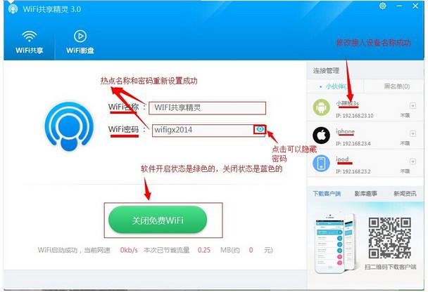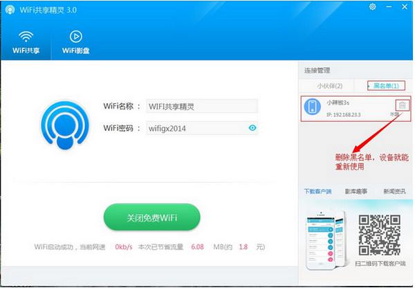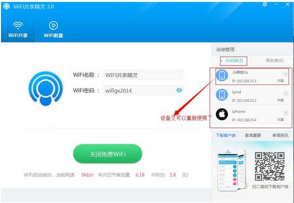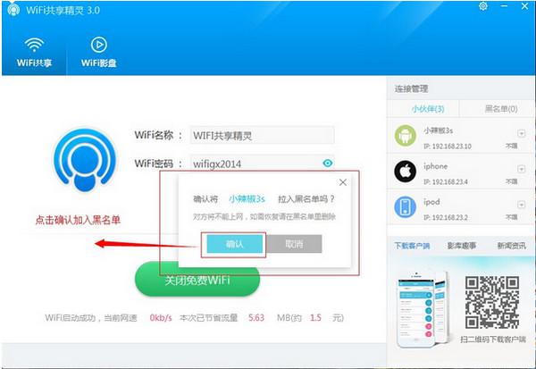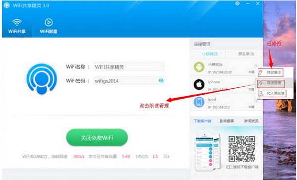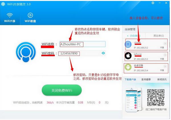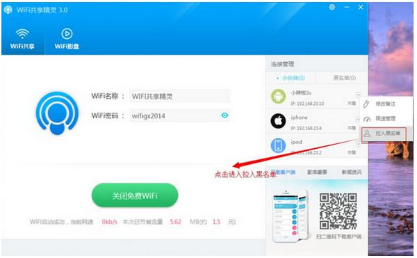 现如今,WIFI覆盖范围越来越56. 我希望我跟你的名字能写在一起,不管是在婚礼的喜帖上,还是在葬礼的墓碑上。广泛,在商店、超市、旅馆、餐厅都有WiFi接口。WIFI热点可以无限共享网络给我们的生活带来了很大的方便,但是如果没有WIFI设备该怎么创建WIFI热点呢?WIFI共享精灵就是一款基于PC无线网卡应用的无线共享的软件,只需所处的区域有wifi网络,就能通过无线网络跟他人共享数据。接下来,小编就给大家介绍下WIFI共享精灵的使用方法。  软件介绍 WIFI共享精灵就是一款基于PC无线网卡应用的无线共享的软件,通过一键设置,将笔记本变成无线路由器,让WIFI手机及PAD实现共享上网,不需要服务器支持,支持消息收发。 功能介绍 1、免费上网 电脑下载WIFI共享精灵,开启免费wifi,智能设备连接共享热点,无需流量即可免费上网! 2、手机观看电脑硬盘大片 扫描软件界面上的二维码下载WIFI上网精灵,启动影盘,选择有资源的电影文件夹,手机打开WIFI上网精灵连接开启成功的免费WIFI热点,手机即可观看电脑硬盘大片。 3、设备连接管理 当智能设备连接热点后,可以对接入的设备进行“修改备注”、“限速管理”、“拉入黑名单”等设置。 4、会员中心 登陆WIFI共享精灵电脑版的会员中心,邀请小伙伴免费观看电脑硬盘大片即可100金币。填写“邀请人暗号”、 “幸运大转盘”、“刮刮乐”等游戏。即可获得丰厚金币奖励兑现换话费,精美礼品等你来! 软件特色 1、只需一步,让你的电脑“一秒种变热点”给你的手机、IPAD、touch等共享上网!XP也能用; 2、 共享上网 使用WIFI共享精灵 ,用户可以通过WIFI分享因特网连接(3G无线、ADSL拨号等); 3、使用方便 智能识别互联网网卡和无线网卡,无需手工选择。智能一键开启WIFI共享,简单方便,无压力; 4、安全连接 可自定义无线共享帐号,密码,自主性极高,带防蹭网防火墙(可以T人),有效控制别人蹭网; 5、永久免费 软件永久免费、自动升级、专业客服实时在线提供服务。 使用方法 第一步:软件开启成功设备连接成功后,修改热点名称和密码,修改设备接入名称:  第二步:修改热点名称、密码(可以隐藏密码)、设备接入名称成功后:  第三步:限速管理---选择要限速的设备名称--点击限速管理---拖动要限速设备下的下划线上的倒三角形滚动图标进行限速:  点开限速管理,拖动倒三角形符号可以调节限速大小:  第四步:设备拉入黑名单---选择要拉入黑名单的设备名称--右击右边的倒三角形---点击进入拉入黑名单--点确定--成功拉入黑名单--删除黑名单--设备继续成功使用:  点击确定拉入黑名单:  成功拉入黑名单:  设备拉入黑名单后如何恢复? 先删除黑名单:  然后重新加入,就可以使用了。 开启免费WIFI,实现共享上网——WIFI共享精灵九死一冷若冰婉转悦耳霜生7. 倘若希望在金色的秋天收获果实,那么在寒意侵人的早春,就该卷起裤腿,去不懈地拓荒播种耕耘,直到收获的那一天。59. My deskmate admires my fluent English very much and I usually feel encouraged by his compliments.(2013.湖北)195.细雨鱼儿出,微风燕子斜。《水槛遣心二首》之一 月洗高梧,露溥幽草,宝钗楼外秋深。土花沿翠,萤火坠墙阴。静听寒声断续,微韵转,凄咽悲沉。争求侣、殷勤劝织,促破晓机心。寻声暗问弹者谁,琵琶声停欲语迟。WIFI共享精灵,WIFI共享The evidence suggests that, on balance, people today tend to concern themselves with only practical matters that are related to their life. |