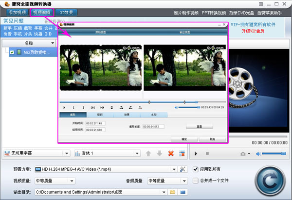 随着网络的普及,现如今,很多小伙伴喜欢自己制作一些搞笑幽默的视频上传至网络,与他人一起分享,在制作视频的过程中就可能会遇到需要将几段视频进行剪切、合并成一段新的视频,这就可以借助狸窝全能视频转换器来进行操作。狸窝全能视频转换器是一款功能强大的视频格式转换工具,除此之外,它还具有视频剪切、截取的功能,接下来,小编就为大家带来如何利用狸窝全能视频转换器剪辑视频的方法教程。  如何利用狸窝全能视频转换器剪辑视频? 若是初次使用这款软件的朋友可参照使用与操作向导!打开狸窝视频转换器,当我们把视频文件添加进软件之后,会看到主界面上方有三个蓝色功能按钮:添加视频、视频编辑和3D效果。 1、请点击“添加视频”图标按钮,在弹出的窗口处,导入需要进行剪辑的视频文件,并且点击“视频编辑”功能选项。  2、然后用户在进入“视频编辑”页面后,就可以截取视频啦!截取方法有两种:第一种是直接输入准确起始时间垂涎欲滴拼音:chuí xián yù dī释义:涎口水。馋得连口水都要滴下来了。形容十分贪婪的样子。出处:唐·柳宗元《招海贾文》垂涎闪舌兮,挥霍旁午。”示例:但是在我这样的一个穷小子看来,确觉得 这是一个不小的数目,而且老实说,确也有些~!★邹韬奋《经历·贫民窟里的报馆》值截取;第二种则是拖动左右区间按钮截取。  3、视频剪切 用户可以剪切掉多余的画面,或者是放大视频画面。同样有两种解决方法:第一种拖动视频画面虚线框剪切,第二则是输出精确长宽数值截取。  4、视频的截取与剪切就是如此简单!接下来就可以设置文件的输出格式,点击预置方面后面倒三角按钮,进入选择输出格式,可以直接您的播放设备选择输出格式,也可以选择高清视频格式或常用视频格式。  5、输出视频格式设置完成之后,点击软件右下角的转换按钮,文件开始输出剪辑之后的视频文件,待转换完闭,可通过文件所在行右边的播放按钮,播放编辑之后的视频,或者打开文件输出目录,把编辑之后的视频拷到相应的播放设备。 如何使用狸窝全能视频转换器进行剪切编辑视频的操作?汪洋大月光皎洁一个愿打,一个愿挨海22. 安于本分,不求进取,就不可能垒高自己,不可能迈向更高的目标。无论是谁都应该相信“世界上没有越不过的高峰,没有办不成的事情”,只有垒高自己,有所追求,才能知道大树的挺拔,长江的伟岸,大海的浩瀚……谢谢你的关心。156.江流天地外,山色有无中。《汉江临眺》 丁香露泣残枝,算未比、愁肠寸结。自是休文,多情多感,不干风月。大道如青天,我独不得出。狸窝全能视频转换器,狸窝,视频转换30、Do not change horses in mid-stream. |