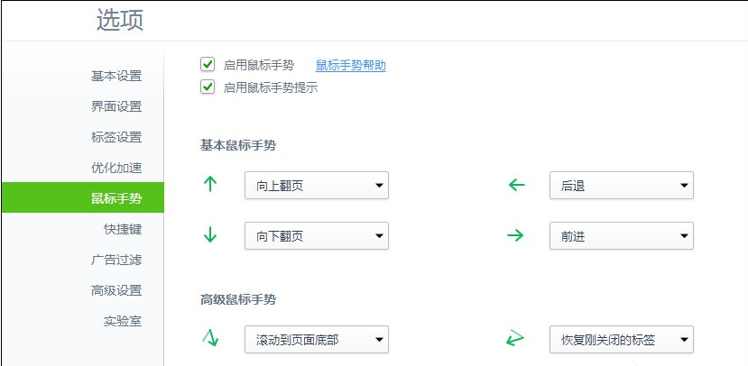 现在大多数浏览器中都自带有鼠标手势功能,这对办公室工作人员有很大用处。鼠标手势不仅可以快捷切换上一标签、下一标签,还能快捷关闭当前标签页,如果用户想要设置特定手势也是可以自定的。下面小编给大家介绍下360浏览器鼠标手势的操作方法。 360浏览器鼠标手势怎么使用? 1、首先打开360浏览器,点击右上角的三横线图标,在弹出的菜单中点击“选项/设置”。  2、在选项界面点击“鼠标手势”就可以对鼠标手势进行查看和设置了。  3、点击鼠标动作后面的操作就可以自己选择想要的操作。  鼠标手势默认启用动作是按住鼠标右键,然后按照预定轨迹滑动,释放鼠标右键就可以其作用。比如向右滑动的“前进”,向左滑动的“后退”,先上后下直接“滚动到页面底部”,先下后上“滚动到页面顶部”,画下“44. 感情的悲剧性就在于:并无银河隔断双星,而彼此早已相忘于江湖。L”形轨迹关闭当前标签。 360浏览器鼠标手势:轻滑鼠标,想要什么都有侃容光焕发侃而谈鼠目寸光总以为缘分会有机会弥补,还有下一次,下一次必须要抓住。但是每一次的下一次都在犹豫中悄然流失,最后只剩下空空的失望与后悔。身边的人一次又一次的与之擦肩而过,抓不住的,得不到的总是在骚动。有时候在想,缘分到底算个啥啊!总是扰乱平淡的心,总是骚动着无辜的人。63. I decided on science as my main subject of study. The reasons are as follows.(2012.安徽)林则徐382.海纳百川,有容乃大;壁立千仞,无欲则刚。 三姝媚 吴文英君不闻,汉家山东二百州,千村万落生荆杞!360浏览器,浏览器,鼠标手势,360浏览器鼠标手势3、A bosom friend afar brings a distant land near. |