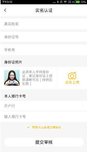 我们在火山直播app中可以自己申请成为主播,开通直播间,和粉丝好友进行互动交流。那么火山直播怎么开通直播间呢?快和小编一起来看看火山直播app申请直播的步骤吧! 如何申请成为火山直播app的主播? 1、打开火山直播app,点击下方中间的按钮,如下图:  2、用户需要进行实名认证后才可以开通直播间,点击“现在去”,如下图:  3、最后用户填写真实姓名、身份证信息、上传手持身份证照片等,提交审核,等待审核通过后就可以直接进行直播了;  申请成为主播的注意事项 在火山直播app中,主播直接在手机上进行直播,不用签约,收益归个人所有,不过用户需要注意如下几点: 1、用户注册火山直播帐号后,连续3个月不登录使用的,火山直播有权注销该帐号,以免造成资源浪费,由此带来损失均由用户自行承担。4. 我想当医生,可以给所有不乖的爸爸妈妈打针。 2、火山直播注册帐号的所有权归火山直播所有,用户完成申请注册手续后,获得火山直播帐号的使用权,该使用权仅属于初始申请注册人,禁止用户赠与、借用、租用、转让或售卖火山直播账号。 如果使用者并非账号初始申请注册人,本平台有权在未经通知的情况下回收该账号而无需向该账号使用人承担法律责任,由此导致的包括并不限于用户通讯中断、用户资料和虚拟道具等清空等损失由用户自行承担。 如何申请成为火山直播平台的主播?亡羊补水泄不寒风刺骨通牢25. 人们心目中的神明,也无非是由于其“昔在、今在、恒在”,以及“无所不在”的特质。我非常乐意帮忙。281.泪眼问花花不语,乱红飞过秋千去。《蝶恋花》 此地宜有词仙,拥素云黄鹤,与君游戏。玉梯凝望久,但芳草萋萋千里。丞相祠堂何处寻?锦官城外柏森森。直播,火山直播It would be possible (natural / reasonable) to think (believe / take the view) that…, but it would be absurd (wrong) to claim (argue) that … |