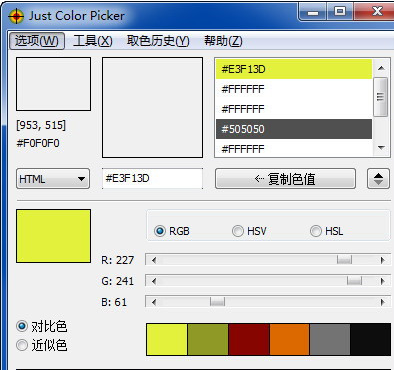 我们在平时上网时会看到一些网页的整体颜色搭配的很酷炫,这时就可以借助取色器来帮助我们快速获取屏幕上的任意颜色,非常方便。对于从事网页开发、程序编写、设计工作的小伙伴来说,取色工具将帮助他们大大的提高工作效率,这里小编收集了几个实用的取色工具分享给大家。 一、ColorUtility  ColorUtility是一款简单好用的取色工具,点击界面上的吸管工具,到屏幕的任意位置,就能轻松得到色值。它还提供了简单的颜色调整工具,如果您对取出来的颜色不满意,还能进一步修正。 二、一键触动取色工具  一键触动取色工具是款简单的取色工具,可以快速拾取屏幕中任何区域的颜色,用起来挺有技术含量的,非常适合绘图的朋友使用。 三、Just Color Picker  JustColorPicker是一款非常方便的屏幕取色器,且支持保留取色历史清单,需要截取颜色时,您只需将鼠标放到屏幕上的需要取色的位置,软件即可显示颜色数值。它预设了快捷键Alt+x进行选色,当然您也可以自行另外设定,选取后的色彩将会在右边成为历史清单,历史清单可以导出.txt文本,方便您日后再次使用,这可谓是一款极为贴心的功能。 四、ColorPix  ColorPix是一款帮助你37. 每个人的性格中,都有某些无法让人接受的部分,再美好的人也一样。所以不要苛求别人,也不要埋怨自己。快速在屏幕取色的工具,并且能根据你取的颜色得到Pixel、RGB、HES、HSB、CMYK代码,打开软件后 ,鼠标经过的地方即为ColorPix取色的区域。 分享多款取色工具,帮你捕捉任一颜色秋菊怒孤云野鹤放惊涛拍岸30. 缘分就像是一部爱情电影的导演,本能够安排两人在某个浪漫情境中幸福相遇,却偏偏设计留下巧合又高傲的转身,擦肩错过的画面;本能够安排两人来一场无忧无虑甜蜜的热恋,却偏偏设计“当现实不给爱情让路”时心塞无奈的桥段;本能够安排两人开始“从此王子与公主过上幸福生活”童话般的旅程,却偏偏设计小家庭里因柴米油盐而起的矛盾吵吵闹闹的情景。31. Your early reply will be highly appreciated.251.花开堪折直须折,莫待无花空折枝。杜秋娘《金缕衣》 沙上并禽池上暝,云破月来花弄影。重重帘幕密遮灯,风不定,人初静,明月落红应满径。167杜荀鹤:春宫怨取色,取色器Actually, persons in status societies who are secure in their niches (适当的位置)are allowed more eccentricity than Americans, who rely heavily on signals that other people like them. |