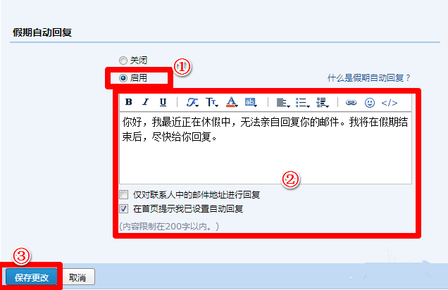 QQ邮箱是我们比较常用的一种收发文件的方式,当我们出差时没有登录邮箱就会遇到没办法及时回复邮件的情况,我们可以给QQ邮箱设置自动回复。下面是小编带来的设置QQ邮箱自动回复的方法介绍,一起来了解下。 QQ邮箱怎么设置自动回复? 1、登陆电脑QQ,选中邮箱图标并点击进入邮箱,当然也可以通过网页进入邮箱。  2、进入邮箱后,选择【设置】打开设置进行的相关的功能设置。  3、在邮箱设置里边选择【常规】设置,如果还想进行其他设置,可以选择其他的设置哦。  4、在常规设置下找到【假期自动回复】的栏目,选择【启用】并编辑自动回复内容,点击【保存修改】即可把以上所有更改内容进行保存。  5、进入写邮件的编辑界面,邮件正文内容下方会显示自己的个性签名。在写邮件的时候还可以在下方的【签名】选项处选择是否使用签名。 启用QQ邮箱自动回复邮件给对方的方法血四分五裂人声嘈杂雨腥风20. 生命里,许多缘分,早已不知去向。飘过的风景,擦肩而过的美丽,却依旧在我的文字里寂静,安然,孤寂!你我不曾远离,晨钟暮鼓依旧余音袅袅。经年的涛声里,是否还有我们一路并肩走过的脚印?那一抹心中的蔚蓝,是否还是最初的模样?90. It is a good opportunity for the only child like me to learn to share and work together.(2008.福建)于谦363.粉骨碎身全不怕,要留清白在人间。《石灰吟》 到此因念,绣阁轻抛,浪萍难驻。叹后约、丁宁竟何据。惨离怀、空恨岁晚归期阻。凝泪眼、杳杳神京路。断鸿声远长天暮。故别,因出此门。有悲往事。QQ邮箱,QQ,QQ邮箱自动回复Finally, the author unfairly trivializes the severity of rural crime by simply comparing it with urban crime. |