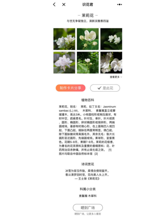 在路边、公园看到漂亮的花花草草,又叫不出名字,我们可以用“识花”工具来测一测。今天,小编给大家介绍的是一款能够识别花草的微信小程序——识花君,它能快速识别花草种类。 微信小程序识花君怎么用? 打开小程序,看到的画面是这样的  你可以点小相机拍照,也可以去相册选图。 让我们来随便找两张有花儿的照片,看看识花君的鉴定结果:  就算花朵很小也能识别的出来,超智能哦。如果你觉得不太像,还可以点击右侧的箭头,看看其他类似的结果。 点进去一个最像的看看:  每种花草不止有科属信息、多图对比,还有可爱俏皮的描述,以及药用价11. 把每一天过好是最大的幸福,快乐源于每天的感觉良好。总忧虑明天的风险,总抹不去昨天的阴影,今天的生活怎能如意?总攀比那些不可攀比的,总幻想那些不能实现的,今天的心灵怎能安静?任何不切实际的东西,都是痛苦之源,生命的最大杀手是忧愁和焦虑。值甚至诗词典故。 最贴心的是,「识花君」居然还能帮你自动保存识花记录!  回到主页点击「我的」,你看,之前搜过的记录都在这里了,超方便! 不仅如此,主页下方中间,还有一个识花「广场」的入口,让你足不出户就能饱览万花,看看其他人眼中的花花草草。  看!有这么多没见过的新奇品种呢。 除此之外,在最近的更新中,广场里还添加了「每日最佳」的板块,每天会公布被赞最多的前5名。  在「美文」频道里面有一些关于植物养护、健康养生之类的小文章。 遇到不知名的花花草草,掏出手机,用「识花君」小程序扫一扫,立刻就知道你面前这个小家伙姓甚名谁啦。 小程序识花君:扫一扫即可识别花草信息头重脚静静地想(静思默安步当车想)轻人生道路虽很曲折,却很美丽。只要你细心观看,就能饱尝沿途美景。10 节假日活动168.云想衣裳花想容,春风拂槛露华浓。《清平调》 留春不住,费尽莺儿语。满地残红宫锦污,昨夜南园风雨。故园东望路漫漫,双袖龙钟泪不干。微信,小程序,识花君In addition, while it is true that many voters change their minds several times before voting, and that some remain undecided until entering the voting booth, this is not true of everyone. |