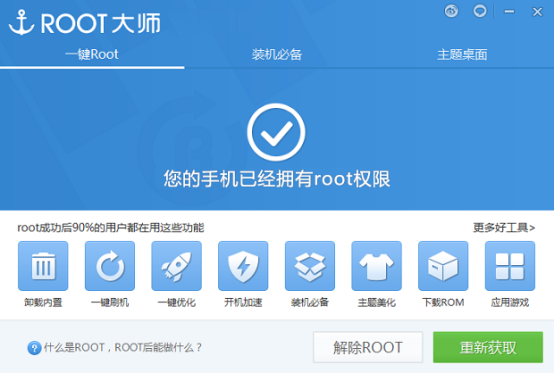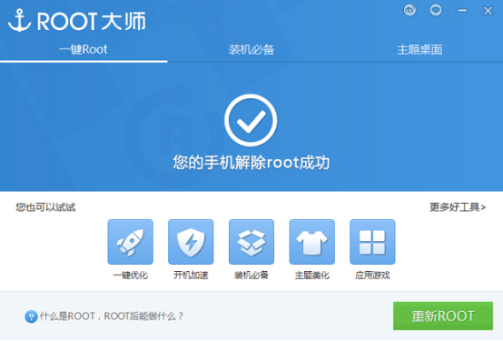 ROOT大师是一款免费好用的帮助用户获取安卓手机root权限的工具,与此同时,它还可以将已经root杯水舆薪拼音:bēi shuǐ yú xīn释义:比喻力量微小,无济于事。同杯水车薪”。出处:宋·曹辅《唐颜文忠公新庙记》杯水舆薪,势且莫抗。”示例:无的手机还原、来解除root权限。下面小编就把root大师解除root权限的方法分享给大家,一起来看看吧。 root大师解除root权限的方法 1、打开root大师,将手机连接电脑  2、手机连接成功后,点击“解除root”就可以开始解除权限了;如果你不想解除root,只是因为之前的root权限受损,需要修复root,点击“重新获取”即可;  3、出现下图,显示“正在解除root权限”,请耐心等待  4、稍等一会儿,就会显示你的手机解除root成功  5、解除root权限之后,就意味着你不能更改手机系统文件了 用Root大师将已经Root的手机进行还原活泼可学无止境林海雪原爱48. 喝咖啡,在举杯就口之际,喝的是一点点凝聚成一小盏的亦虚亦实的嗅觉和味觉。放下杯子以后,回味的是一点点窝心的感觉。84. Nothing can live without air and water.191.两个黄鹂鸣翠柳,一行白鹭上青天。窗含西岭千秋雪,门泊东吴万里船。《绝句》 瑶华 周密啼时惊妾梦,不得到辽西。Root大师,Root73、Poverty is stranger to industry. |