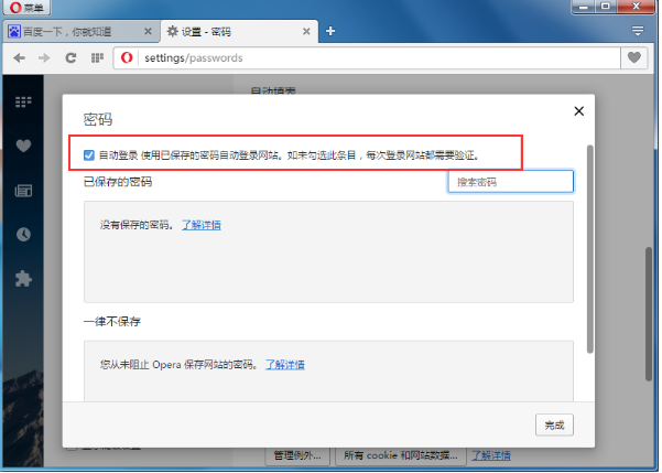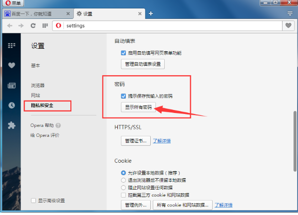 我们在使用Opera浏览器时登陆的网页账号密码可以自动保存,在下次打开网站时就不用输入了账号密码。下面小编就给大家说说开启Opera浏览器自动保存密码的方法,一起来了解下吧。 Opera浏览器如何自动保存密码? 1、首先我们打开Opera浏览器,然后在其左上角的“菜单”中打开“设置”;  2、来到设置界面后我们在左侧打开“隐私和安全”,接着在右边找到“密码”并勾选上“提示保存我输入的密码”;  3、之后我们在打开“显示所有密码”,并在里边勾选上顶部的“自动登录”,最后点击“完成”;  4、完成以上步骤后,我们在Opera浏览器中输入的密码机就会被自动保存了,再次打开该网站也无需我们重复登录了。 设置opera浏览器保存网页密码的图文步骤化干三三两两戈为玉壮志凌云帛40. 生命中多少缘分来去如风,转瞬间从熟悉变成陌生。多少感情深藏心中,难以割舍却成了一生的心痛。人心总有冷暖,要有几多真诚,才能肝胆相见。聚散本无由,不怕伤了心,最怕不领情。真情是隐于心底,却又难以触及。随着现代科技的迅速发展,互联网已经成为生活和工作中必不可少的一部分。387.天下事有难易乎?为之,则难者亦易矣;不为,则易者亦难矣。彭端淑《为学》 烟光摇缥瓦,望晴檐多风,柳花如洒。锦瑟横床,想泪痕尘影,凤弦常下。细草微风岸,危樯独夜舟。opera,浏览器,opera浏览器,密码49、Life is a span. |