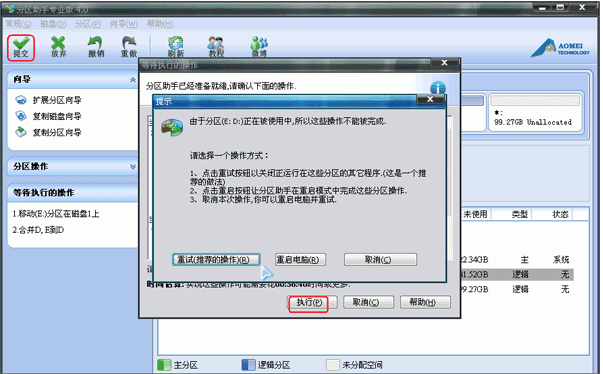 分区助手是一款多功能的磁盘分区管理工具,用户可以轻松上手操作。如果你想扩大某个磁盘空间,可以通过分区助手将分区进行合并,从而实现增大磁盘空间。下面是具体的操作步骤,一起来看看吧。 如何用分区助手进行分区合并操作? 合并分区可以直接合并两个相邻的盘,不用改变相邻两个盘的数据,将两个小的分区合并成为一个大分区,以充分的利用剩余空间。 合并未分配空间到一个分区 1、运行分区助手,如图1所示:可以看到C盘大小约为29GB,在磁盘1上有两个未分配空间(Unallocated),现在就以将两个未分配空间合并进C盘为例;  2、选中C,点击鼠标右键选择“合并分区”或者在侧边栏分区操作中选择“合并分区”,如下图2所示;  3、在弹出的窗口中,勾选需要合并的未分配空间,当有多个未分配空间时可以同时选中多个,然后点击确定,返回到主界面;  4、提交以上操作,点击工具栏的“提交”按钮,在弹出的窗口点击“执行”,如图4。 执行过程中可能需要花一会时间,所花时间的长短由分区中的数据的多少而定。这需要您耐心地等待,请不要强行终止程序:  合并两个已存在的相邻分区 1、如图5,将D和E合并,前面的操作步骤都是一样的。D和E盘合并到D盘(注意:合并之后在D盘之下会建立一个 e-drive的文件夹,E盘的数据都会被移动到这里),勾选D、E,在右下角选择合并到D  2、最后确认您要执行的操作,然后点击工具栏的“提交”按钮,在弹出的窗口点击“执行”,操作过程中可能要重启电脑,在弹出的窗口中点击“是”, 以让程序在重启模式下完成等待执行的操作,如图6。 执行过程中可能需要花一会时间,所花时间的长短由分区中的数据的多少而定。这需要您耐心地等待,请不要强行终止程序。  3、有时不是必须要重启,但是当前要进行操作的分区上有程序正在运行,点击“执行”后会弹出如图7所示的提示对话框窗口,提示关闭正在这个分区上运行的程序,点击“重试”,可以关闭当前正在运行的程序,避免重启: 分区助手轻松归并相邻磁盘分区的方法分享学无止人才多(人才济惊天动地济)境4. 共和国迎来了她五十诞辰。五十年像一条长河,有急流也有缓流;五十年像一幅长卷,有冷色也有暖色;五十年像一首乐曲,有低音也有高音;五十年像一部史诗,有痛苦也有欢乐。长河永远奔流,画卷刚刚展开,乐曲渐趋高潮,史诗还在续写。我们的共和国正迈着坚定的步伐,跨入新时代。16.双方的论点 argument on both sides乐府名歌131.江南可采莲,莲叶何田田。《江南》 春梦人间须断,但怪得当年,梦缘能短。绣屋秦筝,傍海棠偏爱,夜深开宴。舞歇歌沉,花未减、红颜先变。伫久河桥欲去,斜阳泪满。娉娉袅袅十三馀,豆蔻梢头二月初。分区助手,分区,磁盘Thus, the author unfairly assumes that highly - rated public television programs are necessarily widely viewed, or popular. |