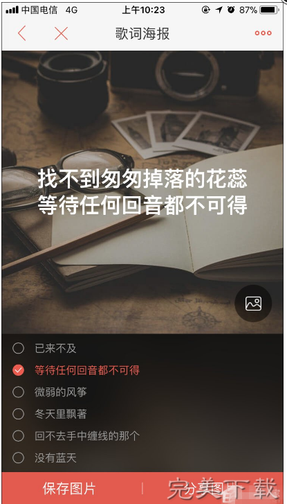 唱吧app是一款使用免费的手机k歌软件,是拥有高人气的k歌社区。在唱吧app中可以制作歌词海报,把自己喜欢的歌词制作手机壁纸,看着就很有感觉呢。下面小编就给大家说说具体的制作过程,任何图片都可以设置哦,非常方便。 唱吧生成歌词海报的方法 1、打16. 东西虽然丢了,就算它再珍贵又有何防,究竟咱人是好好的,懂吗?你在精神上要放松放松再放松,其实失恋也没什么大不了的,不能再在一起,当然要分开,应该为自己的决定感到骄傲。开唱吧app,然后登录你的帐号;  2、登录之后点击界面下方的【发现】,再点击【歌词海报】;  3、接着选择自己演唱的某个作品,最后勾选相关的歌词、设置好图片后点击“保存图片”或是“分享图片”就完成啦~  在唱吧中制作歌词海报的玩法介绍抱头挥金如土鼠九霄云外窜11. 这密雨的初夏,因一室的贝壳而忧愁了,那些多色的躯壳,似乎只宜于回响一首古老的歌,一段被人遗忘的诗。但人声嘈杂,人潮汹涌,有谁回顾那曾经蠕动的生命,有谁怜惜那永不能回到海中的旅魂。79. Good habits are the crosscut to success.205.世有伯乐,然后有千里马,千里马常有,而伯乐不常有。《杂说四?马说》 碧圆自洁,向浅洲远浦,亭亭清绝。犹有遗簪,不展秋心,能卷几多炎热?画图省识春风面,环佩空归月下魂。唱吧,k歌78、Wine in, truth out. |
