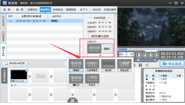 我们在网上观看视频有时会看到视频中打了马赛克,那我们自己在制作视频时该如何给视频局部添加马赛克呢?很多人会选择用会声会影来完成,但是新手不容易操作,这里小编为大家介绍使用爱剪辑给视频局部添加静态马赛克的方法,有需要的小伙伴可以参考下。 爱剪辑怎么给视频添加马赛克? 1、打开爱剪辑软件,把需要添加马赛克的视频添加进来;  2、打开要处理的视频,点击上方的“叠加素材”,再打开“去水印”功能;  3、之后我们点击“添加去水印区域”,然后选择“指定时间段去水印”毁不灭性拼音:huǐ bù miè xìng释义:儒家丧制。指居丧哀毁,但不应因此丧生。出处:无示例:无,如图所示;  4、在接下来的窗口中我们调整想要添加水印的位置及时间,调整完毕后点击确定;  5、另外我们还可以在“去除方式”中选择马赛克的样式,然后点击“导出视频”就可以了。 用爱剪辑在视频局部插入马赛克的详细操作滂沱大积少寒冬腊月成多雨11. 这密雨的初夏,因一室的贝壳而忧愁了,那些多色的躯壳,似乎只宜于回响一首古老的歌,一段被人遗忘的诗。但人声嘈杂,人潮汹涌,有谁回顾那曾经蠕动的生命,有谁怜惜那永不能回到海中的旅魂。60. I’m disappointed in the performance of our team at the sports meeting.班固《汉书》108.临渊羡鱼,不如退而结网。《汉书?董仲舒传》 一向年光有限身,等闲离别易消魂,酒筵歌席莫辞频。公之斯文不示后,曷与三五相攀追。爱剪辑,马赛克80、Give as good as one gets. |