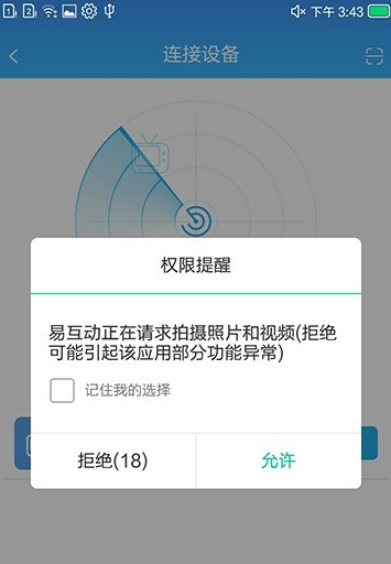 易互动是一款将手机与电视电脑相连接、实现手机遥控的强大应用,它可以将手机中的视频推送电视上播放,畅享大屏体验。那该如何用易互动连接手机与电视呢?别急,下面小编就给大家详细介绍。 如何用易互动连接手机与电视? 一、进入“设备连接”界面 有两种方法可以实现: 第一种,若您当前在主页,并且手机此时并没有连接任何电视,则可以点击如下图所示的智控按键或者是其上的“您还没有连接电视‘点击连接’”按钮,然后就可以进入“设备连接”界面了。  第二种,若您在控制面板,则可以点击设备名称来进入“设备连接”界面,如下图所示  二、自动搜索电视机 “设备搜索”界面如下图所示,正中间是当前连接到的WiFi名称,其下方是搜索到的设备列表,以及一系列的功能按键  三、手动连接电视机 如果自动连接无法搜索到您的电视机,或者您家里电视太多,可以试试以下方式来手动连接手机与电视。 1、IP地址连接 点击左下角的“网络检测”按钮可以进入网络检测界面,如下所示  在提示框中输入您电视机的IP地址,然后点击开始检测,若是检测到此IP地址,则按钮变为“尝试连接”,如下  点击“尝试连接”按钮即可连接电视了,就可以实现手机远程控制电视了。 2、扫描二维码连接 点击“设备连接”页面右上角的“二维码扫描”按钮后即可进入扫码界面,通过扫描电视端易互动的二维码连接电视。 首次使用该功能时会有提示如下,请求相机权限,一定要记得选择“允许”哦~  扫码界面如下  四、连接指引即帮助 点击右下角的“连接指引”按钮即可进41. 分手后不要回头,就算那段感情再甜蜜它也只是一个曾经。入使用帮助页面,如下所示 您可以根据您的电视型号选择不同的选项,下方的常见问题一定要注意查看,认真读过后可以为您减少很多不必要的麻烦呢。  易互动支持手机远程控制电视电脑、电视画面截屏等操作,等你体验哦。 用易互动连接手机和电视的图文步骤暴雨如马到成功朝夕相处注44. 其实,世事皆可作如此观,有浪,但船没沉,何妨视作无浪;有陷阱,但人未失足,何妨视作坦途。44. I suppose electronic dictionaries are convenient, but Iead to laziness!陈子昂144.前不见古人,后不见来者。念天地之悠悠,独怆然而涕下。《登幽州台歌》 孤馆度日如年。风露渐变,悄悄至更阑。长天净,绛河清浅,皓月婵娟。243权德舆:玉台体远程控制2、Never judge by appearances. |