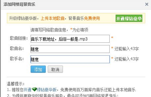 我们在访问他人QQ空间时会听到一些背景音乐,非常好听,这是怎么弄的呢?最直接的方法就是你开通了绿钻,然后就可以设置喜欢的背景音乐,如果杯酒释兵权拼音:bēi jiǔ shì bīng quán释义:释解除。本指在酒宴上解除将领的兵权。泛指轻而易举地解除将领的兵权。出处:宋太祖赵匡胤为了防止出现分裂割据的局面,加强中央集权统治,以高官厚禄为条件,解除将领们的兵权。示例:无你想免费设置QQ空间背景音乐,可以看看下面小编带来的具体方法哦。 如何在QQ空间中免费添加背景音乐? 1、打开QQ空间,找到主页菜单栏里的“音乐”,点击进去!  2、在“背景音乐”界面,可以自己添加音乐,点击“添加网络背景音乐”。  3、这时候弹出一个对话框,然你输入歌曲的地址。这就是我们要添加的了,找到喜欢歌曲的地址添加进去就可以播放了! 注:这边一般为 .mp3 结尾的链接。  4、很多音乐都有自己的版权了:  5、我们可以在咪咕音乐中找到下载地址,虽然是普通版的mp3,  6、这时候我们复制下载地址粘贴到QQ空间的那个添加网络歌曲的地址栏里,手动填写歌曲名和歌手就可以了,点击“添加”。   7、之后就会出现一首歌在下方,这就是背景音乐!  以上步骤就是免费设置QQ空间背景音乐的方法介绍,有需要的用户可以试下(了解更多精彩教程资讯,关注wmzhe.com)。 教你设置QQ空间音乐,不开绿钻无所发五颜六色奋图强顾忌30. 人生的道路上难免会遇到你许多意料之外的事情,比如:地震水灾火灾等的一些灾难。但是,如果你能在灾难中学会保护自己,学会生存,你就能战胜灾难中的困难!53. With their help, I have made great progress.285.不畏浮云遮望眼,自缘身在最高层。《登飞来峰》 丁香露泣残枝,算未比、愁肠寸结。自是休文,多情多感,不干风月。丹灶初开火,仙桃正发花。QQ空间,QQActually, persons in status societies who are secure in their niches (适当的位置)are allowed more eccentricity than Americans, who rely heavily on signals that other people like them. |