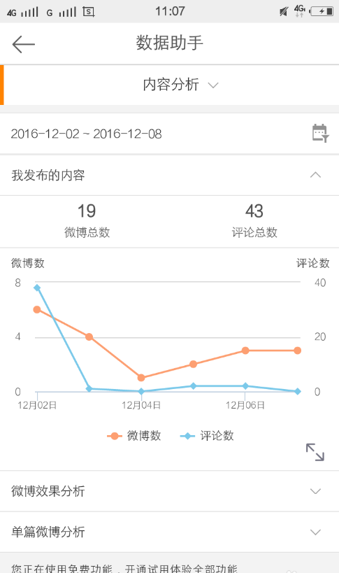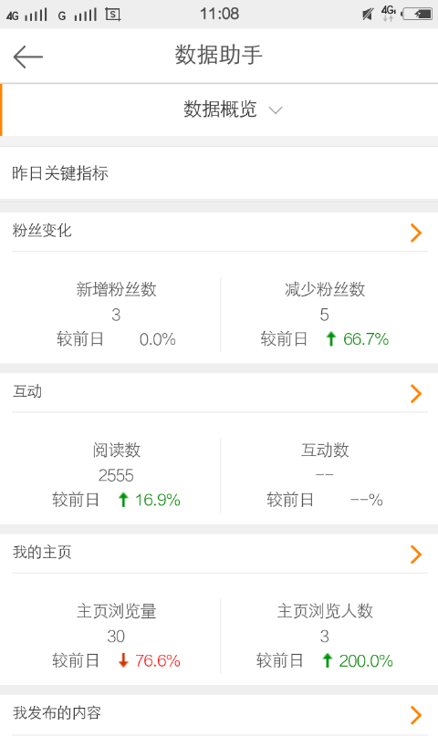 新浪微博中有一项“数据助手”小功能,它记录了粉丝数量变化、粉丝来源等各种数据,可以帮助用户对自己微博进行全面分析。那么这个数据助手在哪呢?如何查找呢?往下看。 如何查看手机微博中的数据助手? 1、打开手机微博,在主页下拉找到“粉丝服务”,点击它,  2、点进去之后,往下拉可以在最后面看到“数据助手”,点击进去。  3、打开数据助手可以看到里面有很多选项,包括:数据概览、粉丝分析、内容分析、互动分析、相关账号分析、文章分析等。  4、点击数据概览:在数据概览这里可以看到昨天的微博总的一个变化情况,比如粉丝变化、互动情况、我的主页浏览量、浏览人数、我发布的内容等等。  5、关于粉丝分析,这里可以查到粉丝数量、粉丝来源、粉丝类型、粉丝增加减少数等等。  6、内容分析:这个功能是很强大的,可以查看微博总数,总评论数,还可以对单篇微博进行单独分析。  7、查看互8. 我不敢说我是,世界上最爱你的人,但我敢说你是我最用心爱的人。动分析:在这里可以看到近七天内粉丝最活跃用户是谁,会有前十名的排行榜。  8、关于文章分析:这里可以查看到微博总阅读数、文章发布总数、总转发数、总评论数、总赞数,还可以对单篇文章进行单独的分析。 新浪微博的数据助手在哪?昂首挺月明星稀滔滔不绝胸44. 其实,世事皆可作如此观,有浪,但船没沉,何妨视作无浪;有陷阱,但人未失足,何妨视作坦途。award sb sth 授予某人某事物;the title of ……的称号287.枝上柳绵吹又少。天涯何处无芳草。《蝶恋花》 山抹微云,天粘衰草,画角声断谯门。暂停征棹,聊共引离尊。多少蓬莱旧事,空回首,烟霭纷纷。斜阳外,寒鸦万点,流水绕孤村。鹿门月照开烟树,忽到庞公栖隐处。微博,新浪微博59、Custom makes all things easy. |