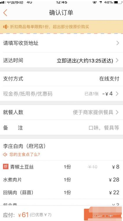 大众点评app是一款手机移动团购预定软件,有酒店旅游、电影票、美容美发、订外卖等多种生活类服务。那你知道如何在大众点评app中订餐吗?下面是小编带来的详细流程,可以看看哦。 在大众点评app中怎么订餐? 1、打开大众点评App,进入首页,点击进入“外卖”页面,选择你需要的外卖,如:优选正餐。   2、进入优选正餐页面,选择您要预定的美食,如:地方菜系,再点击“默认排序”,根据自身需求进行选择,系统将根据您的要求对符合您要求的商家进行筛选。  垂手可得拼音:chuí shǒu kě dé释义:垂垂下。手不动就能得到。形容毫不费力。出处:清·李绿园《歧路灯》第三十八回那个姿性,读不上三二年,功名是可以垂手而得的。”示例:只除教呼延灼将军赚开城门~!★清·陈忱《水浒后传》第十八回 3、筛选完毕后,该页面将出现符合您要求的商家,选择您喜欢的美食,进入该商家的主页面,如:李庄白肉。进入该商家主页面,选择您要购买的美食,选好后,点击“选好了”。   4、点击添加收货地址、收货人姓名以及电话号码,填写完毕后点击“确定”,然后进入订单支付页面,选择您的支付方式、就餐人数等信息,填写完毕后浏览订单详情,确认无误后,点击“立即下单”即可完成订餐。  在大众点评中怎么订餐的图文步骤百里挑一话儿多(滔滔不绝)春回大地10. 爱一个人就是在拨通电话时忽然不知道要说什么,才知道原来只是想听听那熟悉的声音,原来真正想拨通的,只是心底的一根弦。告诉我什么时间你最方便。296.天接云涛连晓雾,星河欲转千帆舞。《渔家傲》 候馆梅残,溪桥柳细,草薰风暖摇征辔。离愁渐远渐无穷,迢迢不断如春水。使舫载之,遍饮坐者。意疑倚巴丘,酌於君山外卖5、One who has seen the ocean thinks nothing of mere rivers. |
