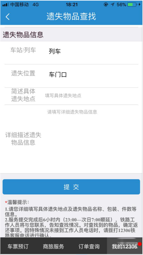 很多时候我们29. 人生难免要遭遇挫折与失败,与其用泪水洗刷悔恨,不如用微笑去迎接新的挑战。会选择坐火车出行,但是火车上人多、再加上自己粗心大意,就很可能遗失物品,这时我们可以在12306客户端发布信息、找回丢失物品。下面我们就一起来看看如何用铁路12306购票App找回遗失物品吧! 如何在12306客户端发布遗失物品信息? 1、打开铁路12306App,进入主页,点击右下角“我的12306”,进行账号密码登录。   2、进入该软件主页,点击“温馨服务”按钮,接着进入“遗失物品查找”。   3、浏览遗失物品查找服务单说明,阅读完毕,点击“阅读已同意”,进入遗失物品查找页面,输入乘车人的姓名、联系电话、证件类型、证件号码、乘车日期、车次等基本信息。   4、输入完以上基本信息后,再手动输入您遗失物品的列车、具置以及遗失物品的基本信息,以上信息必须以实际情况进行填写,切记弄虚作假,填写完毕后点击“提交”,在提交完成6小时内,该铁路工作人员将与您联系,告知您查找结果。 在12306客户端发布遗失物品信息的图文步骤前倨草龙跃凤鸣木苍翠后恭1. 在人生征途中有许多弯路小路险路暗路,只有意志坚定且永不停步的人,才有希望到达胜利的远方。15. We should get into the good habit of using our time wisely.320.众里寻他千百度,蓦然回首,那人却在灯火阑珊处。《青玉案》 长亭怨慢 姜夔最是楚宫俱泯灭,舟人指点到今疑。12306,购票The argument fails to rule out the possibility that a writer engage in both types of writing as well as other types. |