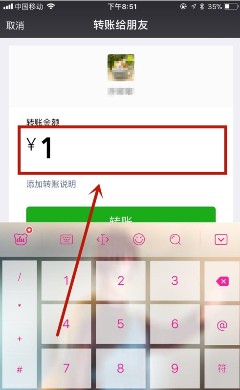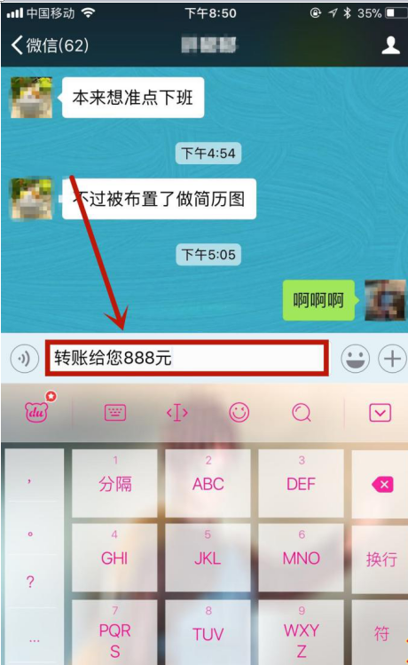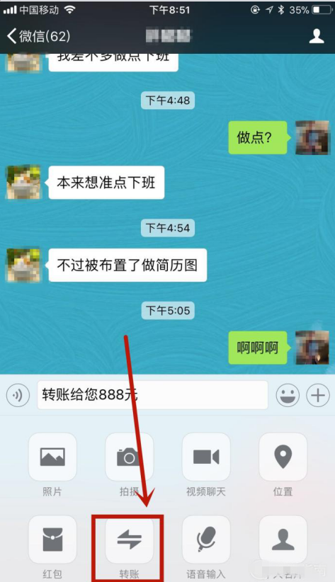 用微信转账、发微信红包是大家比较喜欢的一种和朋友家人打招呼的方式,操作也很方便。今天呢,小编就给大家介绍一种用微信转账整蛊好友的玩法,要用苹果手机操作哦,快来瞧瞧。 苹果手机如何用微信转账整蛊你的好友? 1、打开手机微信,然后随便点击一个好友,如下图所示。  2、接着点击聊天对话框,然后键入“转账给你888”,如下图所示。  3、接着点击屏幕右下方的“+”,然后点击“转账”,如下图所示。  4、接着输入你的转账金额(当然是越小越好,本文以1元为例10. 人生路上,不要沉迷在一片不属于自己的风景里,驻足不前只会错过更多的精彩。),如下图所示。  5、然后点击“转账”,如下图所示。  6、这时候你的好友微信界面会显示如下内容,是不是很好玩。 iphone手机中用微信转账整蛊好友,绝对好玩手张牙舞爪足情深龙潭虎穴5. 生活的海洋并不像碧波涟漪的西子湖,随着时间的流动,它时而平静如镜,时而浪花飞溅,时而巨浪冲天……人们在经受大风大浪的考验之后,往往会变得更加坚强。当你身临暖风拂面,鸟语花香,青山绿水,良田万顷的春景时,一定会陶醉其中;当你面对如金似银,硕果累累的金秋季节时,一定会欣喜不已。你可曾想过,那盎然的春色却是历经严寒洗礼后的英姿,那金秋的美景却是接受酷暑熔炼后的结晶……19. In the past 10 years, great changes have taken place in our school.35.君子喻于义,小人喻于利。 菩萨蛮 辛弃疾杀气三时作阵云,寒声一夜传刁斗。微信64、The older the wiser. |