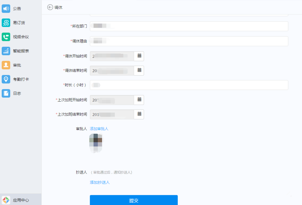 阿里钉钉是很多企业都在用的一款办公辅助软件,使用非常方便,我们可以直接在软件中发送日报、调休申请,那电脑版钉钉怎么发调休申请呢?下面是具体的申请流程,一起来看看吧。 电脑版钉钉怎么发调休申请? 1、打开电脑版阿里钉钉,输寸地尺天拼音:cùn dì chǐ tiān释义:指一小块土地和天空。出处:唐·杜甫《洗兵马》寸地尽天皆入贡,奇祥异端争来送。”示例:无入账号密码,点击登录。登录到钉钉主页面之后,点击左侧的“工作”选项。  2、打开钉钉工作台之后,点击左侧“审批”。  3、在审批界面,找到“调休”。  4、在审批详情里按要求输入对应的内容。  5、输入完成后,添加审批人(一般是你的直管领导),下面可添加抄送人,可抄送给你做考勤的人或者有工作上在你调休期间有业务往来的同时等。点击“提交”。  6、提交完后,自动跳转到如图界面,等待领导审批即可。  7、审批通过后,再次打开就可看到审批完成(同意),这样你的调休申请就完成了。  上述内容就是在阿里钉钉pc版发调休申请的步骤流程介绍,了解更多精彩教程资讯,请关注wmzhe.com。 在钉钉PC端申请休假的相关流程介绍四井然有序通八达枪林弹雨11. 成,如朗月照花,深潭微澜,不论顺逆,不论成败的超然,是扬鞭策马,登高临远的驿站;败,仍滴水穿石,汇流入海,有穷且益坚,不坠青云的傲岸,有“将相本无主,男儿当自强”的倔强。这次活动让我们走近了大自然,使我们从繁重的课业中解脱出来。9. 言者无罪,闻者足戒。 齐天乐 王沂孙明月松间照,清泉石上流。钉钉,阿里钉钉71、A letter from home is a priceless treasure. |