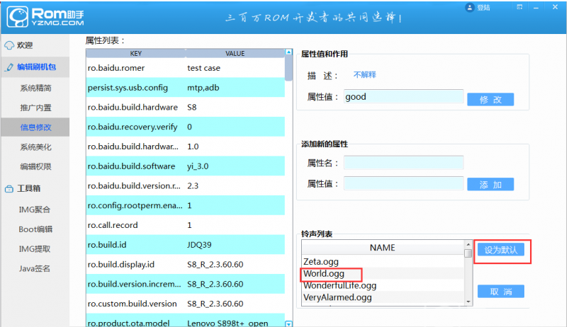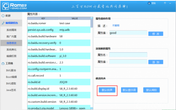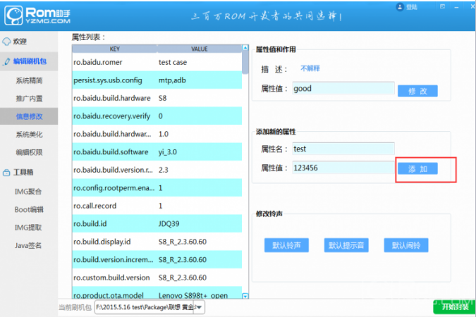 ROM助手是一款刷机包编辑工具,帮助用户实现对手机系统ROM文件的修改和制作,使用也很简单。下面小编给大家说说用ROM助手对刷机包进行信息修改的具体方法,一起来看。 ROM助手如何对刷机包进行信息修改? 1、准备好刷机包,打开ROM助手,点击左侧“信息修改”,然后点击“选择刷机包”,  2、修改信息后,点击“修改”按钮,  3、点击“添加”按钮,添加属性,  4、进行铃声修改,   5、信息修改后,开始封装,封装成功后,如果是卡刷包直接刷机就可以看到修改效果了;如果是线刷包,需要把封装成功的system.img文件替换原刷机包里3. 也许爱情只是因为寂寞。需要找一个人来爱。即使没有任何结局。的文件,然后刷机查看效果。 用ROM助手修改刷机包信息的操作讲解万点繁星无所顾忌鹅毛大雪爱网无关爱不缠,金田有种种金丹,禅心要在尘中净,功行终须世上全,烦恼脱于烦恼际,死生超出死生间,不能火里生枝叶,安得花开火里莲。84. Nothing can live without air and water.崔颢178.昔人已乘黄鹤去,此地空余黄鹤楼。黄鹤一去不复返,白云千载空悠悠。晴川历历汉阳树,芳草萋萋鹦鹉洲。日暮乡关何处是,烟波江上使人愁。《黄鹤楼》 西窗过雨,怪瑶佩流空,玉筝调柱。洛阳女儿对门居,才可容颜十五馀。刷机,ROM助手31.Like and like make good friends. 趣味相投。 |