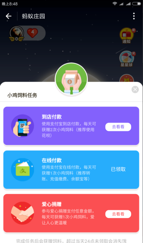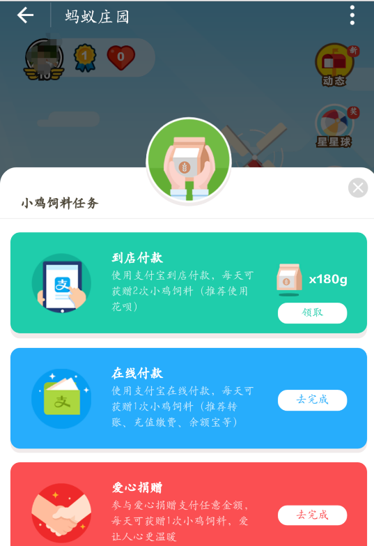 支付宝蚂蚁庄园活动是一项类似于蚂蚁森林性质的捐赠献爱心活动,用户通过养一只小鸡来积累爱心,从而进行捐赠。蚂蚁庄园里面的小鸡要进行饲料喂养,而且消耗饲料特别的快,那有什么办法可以快速获取饲料吗? 蚂蚁庄园如何快速获取饲料? 1、首先,我们登陆支付宝,点击搜索&ld44. 白天有你就有梦,夜晚有梦就有你;你要好好照顾你自己,不要感冒流鼻涕;要是偶尔打喷嚏,那就代表我想你!quo;蚂蚁庄园”进入,  2、进入之后,如果你没有饲料了,你需要获取饲料,这里有三种方法,一种是到店支付,一种是在线支付,一种是献爱心。  3、首先选择到店支付,进入之后,找到最近的商店,去买一些便宜货,就可以回来领取了。  右下角是饲料袋,每满180g饲料可以给小鸡喂一次食物。每天到店支付可以获取两次饲料,爱心捐款一次,转账有一次。  4、每次饲料领取都是180g,爱心捐赠后饲料袋也会升级,可以装更多的饲料,24小时饲料不领取会消失的哦!  5、点开好友界面,蚂蚁庄园还可与好友进行互动,有好友排名,实时更新。还可替好友驱逐在其庄园中蹭饭的小偷鸡,驱逐成功自己也是可以拿几克到二十几克的饲料。  6、点击成功就可获得饲料啦,这些饲料累计起来也是可以多喂几次小鸡,多捐几次爱心啦~ 获得蚂蚁庄园小鸡饲料的方法整理设枝繁叶茂施齐鸟语花香全36. 所有美丽的东西似乎总是沉重的——但我们的痛苦便是我们的意义,我们的负荷便是我们的价值。诗诗,世上怎能有无重量的鲜花?人间怎能有廉价的美丽?4. Not only will our club\'s works be displayed, but we also have a valuable set of paper-cutting created by a famous artist of this field.(2017.全国Ⅱ卷)李贺234.衰兰送客咸阳道,天若有情天亦老。《金铜仙人辞汉歌》 花 犯 吴文英平阳歌舞新承宠,帘外春寒赐锦袍。支付宝1、Give everyone his due. |