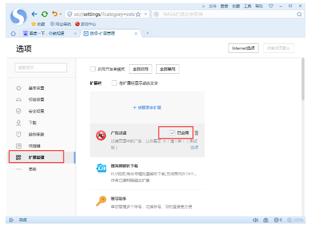搜狗浏览器在长时间使用后,经常会出现浏览器卡死34. 失恋了,好似上帝再给你一次重新选择的机会,让你看清对方,看清自己。让你知道自己真正想要的是什么。的情况,这该怎么办呢?造成这种情况的原因还是有很多种的,不过想要解决也并不难,来看看这篇解决搜狗浏览器卡死的教程吧。 搜狗浏览器总是卡死怎么办? 原因一:插件过多 安装过多的插件是导致我们浏览器卡死的主要原因,大量的插件会占用我们电脑大量的内存,所以经常会出现卡、慢的情况。这种时候我们只需关闭一些无用的插件即可,关闭方法如下: 1、首先我们打开搜狗浏览器,然后在其右上角的“工具”中打开“选项”;  2、接着在选项界面的左边打开“扩展管理”,之后在右边就可以看到我们安装的所有插件了,想要关闭哪个直接取消勾选“已启用”即可。  原因二:缓存过多 随着浏览器使用时间的边长,缓存文件也会越积越多,如果不及时清理也会造成浏览器卡、慢的情况。 原因三:电脑配置过低或者老化 搜狗浏览器同时开启多个页面会非常占用电脑内存,如果我们的电脑配置比较低或者老化,那么很有可能会造成卡死的情况。这种情况的解决办法就只有更换电脑配件了,或者我们在使用的时候尽量不要同时开启多个页面。 原因四:中毒导致 电脑中病毒后使用浏览器肯定经常遇到卡死的情况,这种时候我们可以使用一些杀毒软件清理电脑病毒即可。 搜狗浏览器出现卡死,可以这样应对绚丽困难多(千辛万苦)多包罗万象彩人世沧桑,要为自己留一点空白,留一段风轻云淡的寂寞。寂寞可以让一个人脆弱,也可以使一个人坚强;寂寞可以造就一个人,也可以毁灭一个人。在他们的帮助下,我取得了很大进步。(2009.福建)242.身无彩凤双飞翼,心有灵犀一点通。《无题?其二》 眼儿媚 范成大落叶人何在?寒云路几层?搜狗浏览器,搜狗,浏览器But no evidence is provided to show that this explanation is correct. |