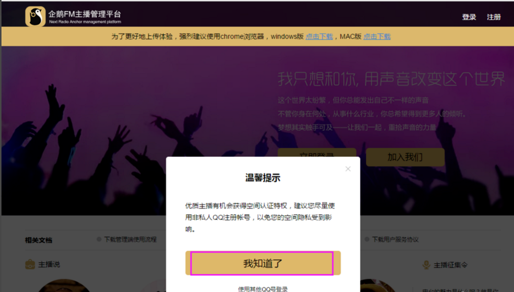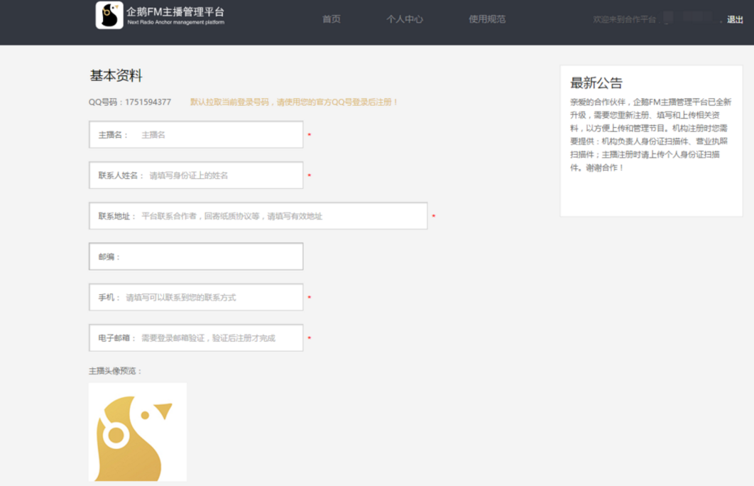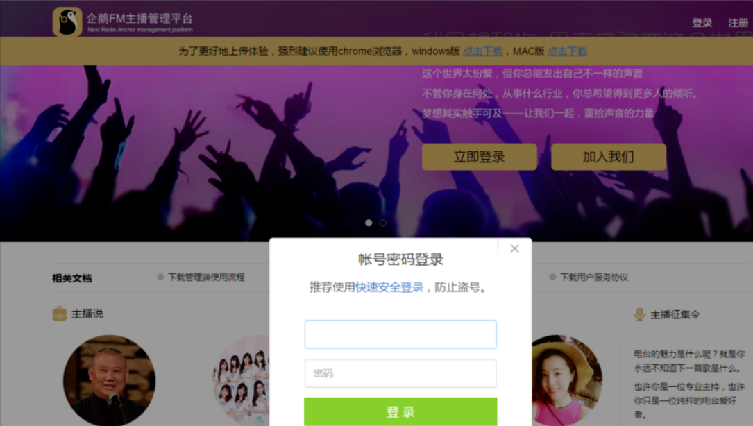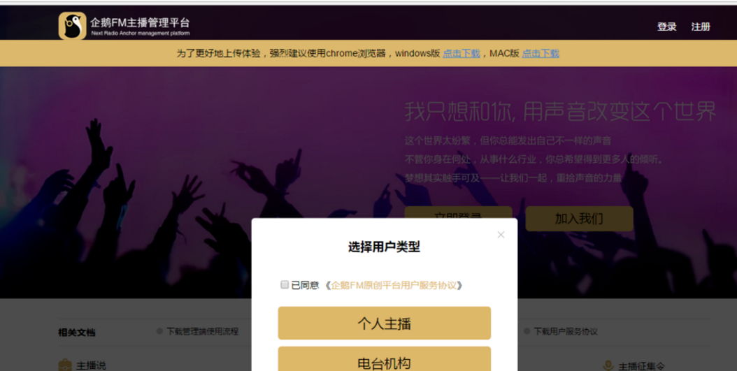 企鹅FM是一款网络电台软件,你可以收听小品、相声、小说等节目,同时你也可以申请注册成为电台主播哦。下面是注册申请企鹅FM电台主播的具体流程介绍,有需要的小伙伴可以了解。 如何注册成为企鹅FM主播? 1、百度搜索企鹅FM官网,打开企鹅FM主播管理平台,点击“加入我们”(有部分浏览器无法上传作品,建议用chrome浏览器打开),  2、登录你的账号,按照提示步骤  3、点击“我知道了”  4、选择用户类型(这里以个人主播为例):勾选服务协议,点击个人主播,  5、进入基本资料填写页面,填写好个人基本资料,点击&ldquo11. 你那不经意间的回眸,像一股晶莹的泉水流入我的心头,比诗还深远,比画还优美,仿佛看到我生命中的一个新的开始。;注册”,  6、资料提交后就进入审核阶段啦,等待审核结果,审核结果会邮件通知,  7、如审核未通过,也会邮件通知,根据未通过原因修改个人基本信息吧。  以上内容就是个人申请成为企鹅FM电台主播的流程介绍,了解更多精彩教程资讯,关注wmzhe.com。 个人加入企鹅FM主播的相关流程介绍眼花缭《崇山峻岭水浒》乱14. 有一种缘分叫做似水流年,有一种宿命叫做碧海青天,假如爱有天意,可否让我在云水深处,与你再次相逢,陪你一起笑看陌上的花开花落,静观天边的云卷云舒。你的如花笑靥,渲染了我的似水流年。我们学校的乒乓球队正在招收新队员。高明《琵琶记》347.不是一番寒彻骨,怎得梅花扑鼻香。 青玉案 贺铸独敲初夜磬,闲倚一枝藤。电台35、He would climb the ladder must begin at the bottom. |