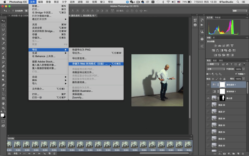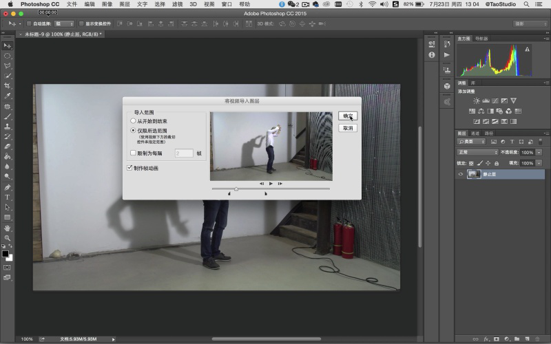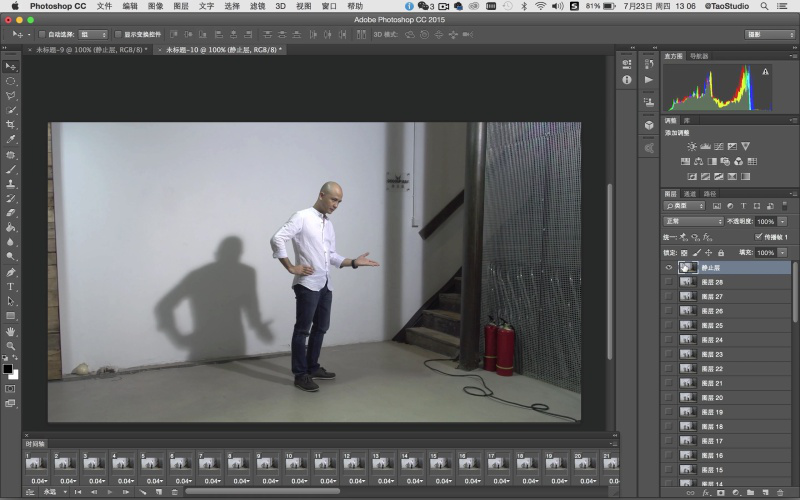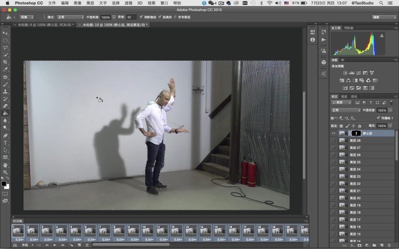 | 内容 | 我们经常会在网上看到很多一些“特别”的图片,特别之处在于,图片看起来是静态的,仔细一看,还有一部分在动的图片,这就是非常流行的一种静态照片中神奇的细微运动技术,也称做是“静帧动画”。那么Cinemagraph是什么?怎么才能制作Cinemagraph动态照片呢? ![]() Cinemagraph是什么? cinemagraph是介于视频和图像之间的一种新形态GIF,与传统的GIF动图相比,cinemagraph具有如电影摄影般优美的画面,向观者展示了静止时空的魔法,能够让凝固的画面与变动的画面交相呼应,一动一静的反差,更是让人体会到了“刹那芳华”的视觉效果。 如何用Photoshop制作动态照片Cinemagraph? 利用Photoshop也可以制作Cinemagraph!核心技术要点是将短视频文件转化为图层序列帧,通过“时间轴”及图层蒙版等功能来实现。 经典案例:舞动的人影 前期拍摄 在这个Cinemagraph拍摄制作前,我们预想:希望人物摆一个很酷的动作,并保持绝对静止。而投在墙面和地面上舞动的人影则保持循环往复的状态。因此在拍摄时我们使用了侧位的聚光灯,使人影形状和角度在画面中能够很好的表现。 使用相机的摄像功能拍摄两个短片,第一个短片摄录设计好的人物静止动作(如上图中人物姿势),由于后期只用到该短片的一桢画面,所以让人物保持静止后,拍摄几秒即可,最后挑一桢最好的画面。第二个短片主要拍摄人影舞动的素材,开拍后让人物上半身舞动出各种姿势,需要注意人物舞动的姿势最好做到重复和可循环,另外人影和人物之间应保持距离,尽量减少重叠,这些要领都是为了后期制作时能够便于处理,使画面流畅自然。 摄录完成后我们便可把两个视频短片导入电脑,进行Cinemagraph制作了。 ![]() 后期制作 第1步 打开Photoshop CC2015,在菜单栏“文件>导入> 视频帧到图层”,首先打开46. 感情的事总是很难说清楚,我知道分手总是令人难过的,但无论如何,我永远都会站在你这一边,支持你。努力让自己快乐起来吧,好吗?用于制作人物静止动作的短片素材。在弹出窗口的“导入范围”中选择“仅限所选范围”,由于只用到一个静止帧画面,所以拖拽范围滑块选取一桢画面即可。此时可以不必勾选“制作帧动画”选项。单击“确定”。 ![]() ![]() ![]() 第2步 将导入图层的一桢画面命名为“静止层”。然后重复第一步的操作步骤,在菜单栏“文件>导入>视频帧到图层”打开人像影子的素材短片,在弹出窗口的“导入范围”中选择“仅限所选范围”,务必勾选“制作帧动画”复选框。然后分别拖拽前后的黑色范围滑块选取短片段落,Photoshop对于影片中的片段剪辑不是很方便,如果你有专业的影片剪辑软件,先编辑好再进行这步会更为方便。在截取时注意最好是完整的一个动作循环,或能够使首尾动作匹配衔接。最后单击“确定”。 TIPS: 如果你使用相机通过连拍获得连续的图片素材,可通过菜单栏“文件>脚本>将文件载入堆栈”,然后用“时间轴”制作帧动画来进行处理。 ![]() ![]() 第3步 选好的视频段落将以序列帧的形式导入图层面板中。并且通过“时间轴”来显示。如果时间轴没有开启,可以在菜单栏中“窗口>时间轴”打开。 ![]() 第4步 在时间轴中播放动画观察影子的变化情况。理论上讲如果短片本身能够完美地循环衔接的话,当你按左下角的动画播放钮时,它就会循环播放变成一个原始的动态照片。但如果不行的话,可以通过在时间轴上增加帧来使动作自然衔接。在本例中是将时间轴中所有帧全选后进行复制,然后将复制好的所有帧做“反向帧”。例如短片原来的顺序是 A>B>C,现在经过复制再反向后便是 A>B>C>B>A,这样的循环就会很流畅,当然也需要根据影片的情况来定,如果是单向运动的话,则不需要这样做。 ![]() 第5步 切换到步骤1中制作静止层的窗口。在图层面板中选取“静止层”图层,单击鼠标右键在弹出窗口中选择“复制图层”,将“静止层”复制到第二个工作窗口中。在图层面板中将复制好的静止层拖拽置顶。 ![]() ![]() ![]() 第6步 在图层面板中选取“静止层”,然后在时间轴中全选所有帧。单击“静止层”前面的眼睛图标(visible),使其可视,这样才能使“静止层”成为所有帧的“静止层”。接下来,在静止层上添加图层蒙版,在工具栏中使用“快速选择工具”对人像外轮廓进行勾选。 TIPS: 对“静止层”进行蒙版操作,以及对整个短片进行调色等全局操作时,务必全选时间轴中所有的帧。这样才能针对整个短片进行控制,而不是针对其中单独的一帧。 ![]() 第7步 对勾选好的人像选区进行反选(Command+shift+I),使用黑色油漆桶工具单击图层蒙版中人物之外的选区部分。这时,除静止人像外的背景全都显露出来。在图层蒙版中使用白色画笔工具,擦除人像活动时残留的重影。这个步骤需要通过在时间轴播放动画来确定擦除的范围,但切记要保留好影子部分。当处理完成后播放动画查看,预想的画面效果已基本呈现出来。此外也可设定每一帧的速度,可以控制影子摆动的速度节奏,在本例中所有帧的速度是0.04秒。下面进一步进行美化处理。 ![]() ![]() 第8步 使用裁剪工具,对画面进行方形构图裁切,去除画面两边杂乱部分,让画面主题更集中。 ![]() 第9步 对画面进行调色,使其具有电影的色调感觉。首先在时间轴中要全选所有帧,然后可以使用渐变映射调色,或之前杂志介绍过的颜色查找调电影色调的方法来进行调色处