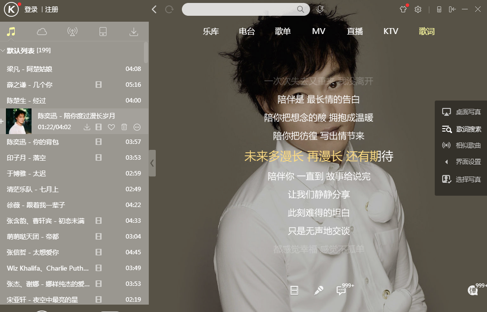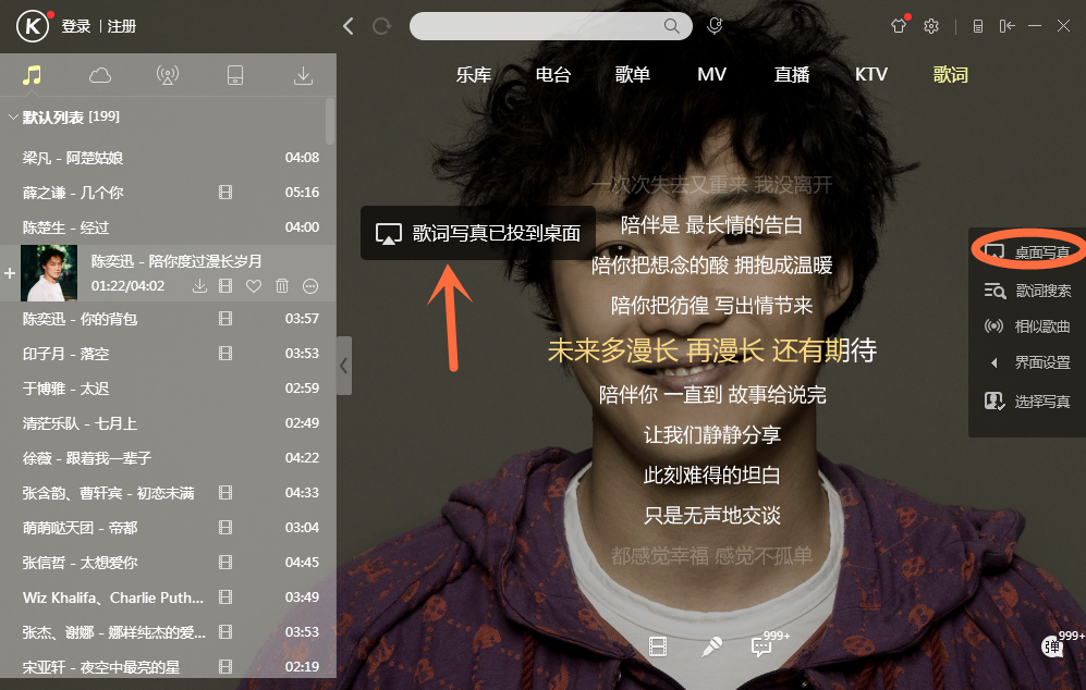 我们在用酷狗听歌时,有时会点击查看歌手写真图片,看到自己喜欢的就想保存下来作为桌面壁纸。在酷狗音乐中有一项功能,可以将歌曲写真设置为电脑桌面,下面小编就给大家演示具体的操作。 酷狗音乐如何设置桌面写真? 1、打开酷狗音乐,播放自己喜欢的歌曲,然后点击“歌词”选项面板,如图所示:  2、将鼠标移动到歌词面板的右边框,等待选择框18. 我想去迪拜当乞丐,一天赚47万元就够了。出现,如图,  3、我们选中“桌面写真”,将写真和歌词投影到桌面上,这时可以看到“歌词写真已投到桌面”的提示,如图,  4、我们可以看到电脑桌面显示的就是歌词写真,而且还会随时变化,如图,  5、在桌面右下角可以看到一条工具栏,选中工具栏上的设置选项,你可以根据需要进行设置。  如何将酷狗中的歌曲写真作为电脑桌面?锦绣怒发冲冠发奋图强山河26. 有一天还是要面对分离,对面这情深缘浅的现实;有一天我们会分道扬镳,变成了最熟悉的陌生人。我个人认为教师是世界上最重要的职业。《诗经》1. 关关雎鸠,在河之洲;窈窕淑女,君子好逑。 风入松 吴文英别来沧海事,语罢暮天钟。酷狗,酷狗音乐39、He that promises too much means nothing. |