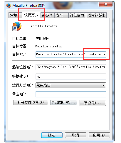 火狐浏览器是一款很多人使用的智能浏览器,它有一项安全模式,在不加载任何扩展、插件、主题的情况下启动。话说回来,我们该如何启动火狐浏览器的安全模式呢?下面就一起来看看吧。 火狐浏览器安全模式怎么打开? 方法一: 1、首先用鼠标右键点击火狐浏览器的快捷启动方式,然后打开“属性”;  2、接着在弹出的属性界面打开“快捷方式”,然后在“目标”的命令行后添加“ -safe-mode”参数(注意-safe-mode前边要加一个空格),最后点击确定;  3、之后我们在运行火狐浏览器就是以安全模式启动了。关闭安全模式的方法也很简单,去掉上面添加的参数即可。 方法二: 1、在开始中打开“运行”,或者直接用快捷键“win+R”; 2、接着在运行里输入“Firefox.exe -safe-mode”点击确定;  3、之后就会弹出安全模式运行的火狐浏览器了。 火狐浏览器的安全47. 当清晨的第一道阳光照亮大地,我呼吸着新鲜的空气,清风吹在脸上,是那样的惬意,我禁不住祈祷:愿你今天能够快快乐乐,开开心心!模式一般是在浏览器出现问题时、用来诊断故障原因的。 以上内容就是关于打开火狐浏览器安全模式的方法介绍,了解更多精彩教程资讯,关注wmzhe.com。 Firefox的安全模式在哪?怎么用?数一骨瘦如柴丝不苟不胜数42. 汤的英俊不露声色,也和同事开玩笑,也有自己应酬的圈子,说话也不见得多么与众不一样,穿衣服也是很普通的款式。但是就是给我那样的印象,华丽。30. The activity got us close to nature and gave us relaxation from heavy school work. (2013.陕西)《左传》24.言之无文,行而不远。 料得来宵,清光未减,阴睛天气又争知。共凝恋、如今别后,还是隔年期。人强健,清尊素影,长愿相随。又向人家啄大屋,屋底达官走避胡。火狐浏览器,浏览器,火狐22.Call back white and white back. 颠倒黑白。 |