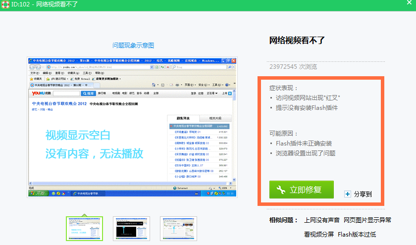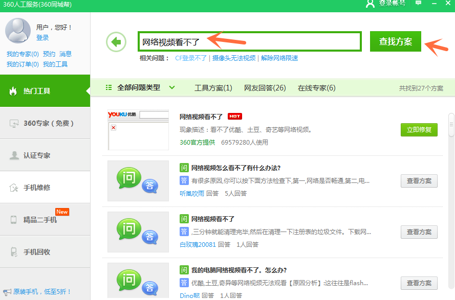 我们在观看爱奇艺、优酷平台上的电影电视时,有时会出现视频看不了的现17. 分手了就做回自己,一个人的世界同样有月升月落,也有美丽的瞬间,把他归为记忆。象,这是什么原因呢?该怎么解决呢?出现这种情况,我们可以试试用360安全卫士中的人工服务来解决,具体过程参见下文。 网络视频看不了怎么解决? 1、在电脑上打开360安全卫士,点击“人工服务”,如下图所示:  2、进去人工服务界面之后,在搜索框中输入“网络视频看不了”,点击查找方案,如下图所示:  3、我们可以看到下方出现了网络视频看不了的修复方案,先点击网络视频看不了的图标,进去查看造成的原因,如下图所示:  4、进去之后,我们可以看到造成的原因可能是flash插件没有正确安装或者浏览器设置出现了问题,点击“立即修复”按钮,如下图所示:  5、我们可以看到已经在修复网络视频看不了的问题了,如下图所示:  6、等待一会儿,网络视频看不了的问题就已经被修复,重新打开视频就可以看到已经正常播放了,如下图所示:  如果你遇到网络视频看不了的现象,可以参照360安全卫士的人工服务来解决,希望对大家有所帮助。 网络视频看不了?试试360人工服务风若隐若现和千锤百炼日丽38. 青春乃心境,而非年华;青春非现于桃面朱唇之艳,灵活矫健之躯,而现于志士之气,遐想之境,激情之盛。生命之泉,涓涌不息,青春常绿。我英语学得很好,因此被选为英语老师的助手。217.试玉要烧三日满,辨材须待七年期。《放言五首?之三》 乡城见月137刘长卿:新年作360,安全卫士,360安全卫士As an American is always striving to change his lot, he never fully identifies with any group. |