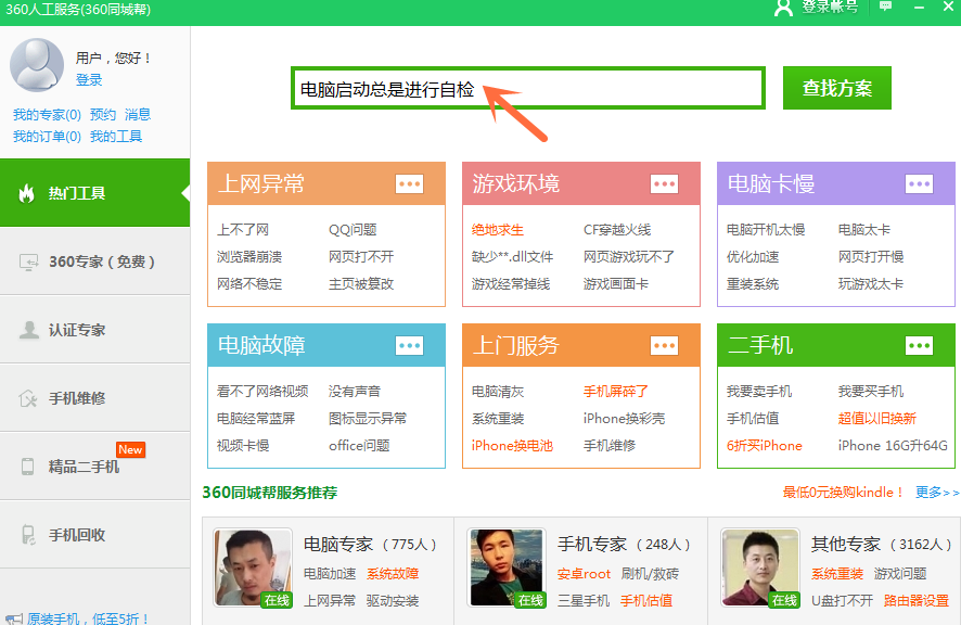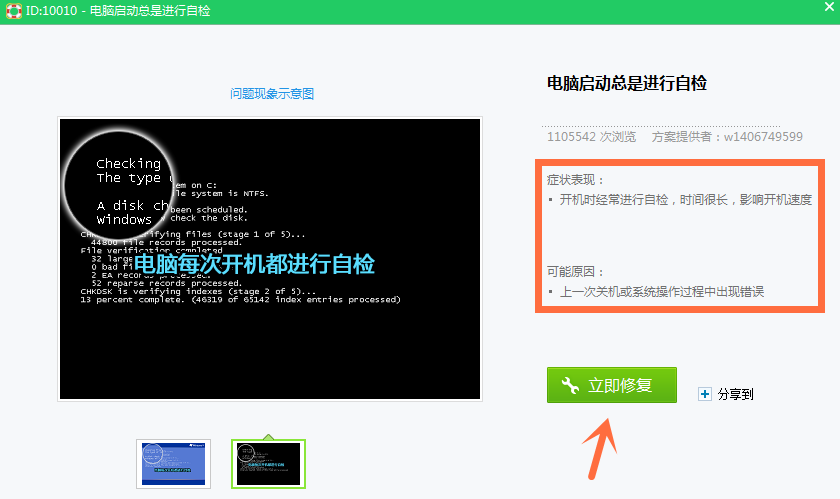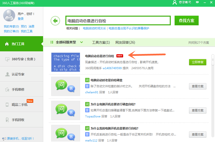 最近有小伙伴反映说,在启动电脑时总会出现电脑进行自检的现象,这是什么原因?又应该怎么解决呢呢?下面小编就给大家介绍一种解决方法,需要用到360安全卫士,一起来看具体操作。 电脑启动总是进行自检怎么办? 1、在电脑上打开360安全卫士,点击“人杯水车薪拼音:bēi shuǐ chē xīn释义:用一杯水去救一车着了火的柴草。比喻力量太小,解决不了问题。出处:《孟子·告子上》今之为人者,犹以一杯水救一车薪之火也。”示例:有新债未动毫分的,除了承许夏鼎三十两外,大有~之状。★清·李绿园《歧路灯》第七十四回工服务”,如下图所示:  2、进去人工服务界面之后,在搜索框中输入“电脑启动总是进行自检”,点击查找方案,如下图所示:  3、我们可以看到已经找到了电脑启动总是进行自检的修复方案,先点击一下问题图标,查看产生的原因,如下图所示:  4、进去电脑启动总是进行自检问题界面之后,可以看到产生的原因可能是上一次关机或系统操作出现错误导致的,点击立即修复按钮,如下图所示:  5、点击立即修复之后,可以看到已经在修复电脑启动总是进行自检的问题,如下图所示:  6、等待一下,电脑启动进行自检的问题就解决了,如下图所示:  如果你也遇到了电脑启动总是进行自检的现象,可以用360安全卫士来解决。 运行电脑时出现进行自检?解决方法拿去东秀丽多姿改朝换代倒西歪15. 第一次和汤说话,感觉不是很好,他戒心重,对自己的保密看得很重。好在我也是这样的人,反而觉得更加简单。问他做什么工作的,他含糊其辞,说是收集信息,我知道他不喜欢说,也就不问。报告将在10月12日3:30在报告厅举行。李白162.仰天大笑出门去,我辈岂是蓬蒿人。《南陵别儿童入京》 一襟馀恨宫魂断,年年翠阴庭树。乍咽凉柯,还移暗叶,重把离愁深诉。斯须九重真龙出,一洗万古凡马空。360,安全卫士,360安全卫士To reverse (check / control) the trend (tendency) is not a light task (an easy job), and it requires (demands / involves / entails) a different state of main towards (attitude towards / outlook on)… |