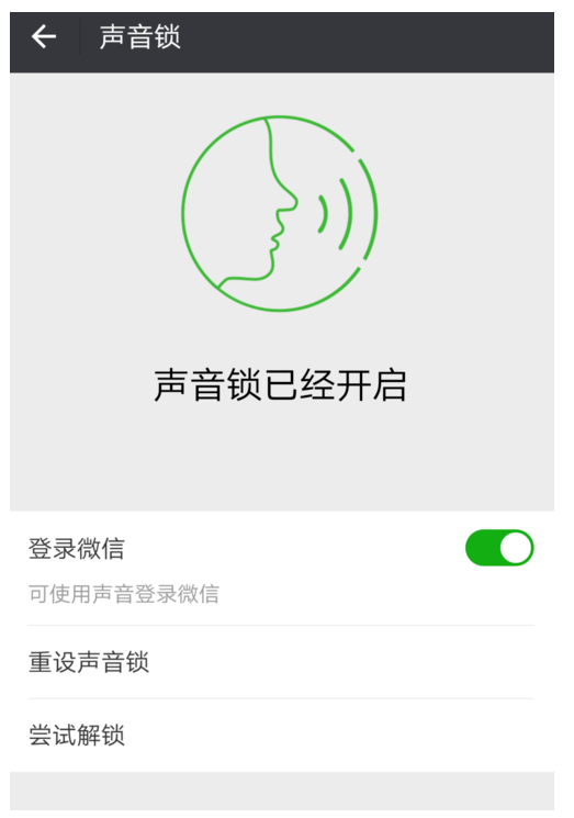 相信很多小伙伴都用过微信中的声音锁功能,在设置声音锁时有一个尝试解锁,这个微信尝试解锁是什么呢?如果想解锁应该怎么操作呢?现在我们就一起去看看吧! 微信尝试解锁声音锁怎么操作? 1、打开手机微信,进入页面,依次点击我——设置,如图,  2、进入到设置页面,我们点击“账号与安全”选项,如图,  3、进入到账号与安全页面,我们点击“声音锁”选项,如图,  4、进入声音锁页面,我们点击“尝试解锁”这一选项,如图,  5、然后会弹出页面,提示说:我们需要验证你的声音,请按住按钮,读出下面的数字;村学究语拼音:cūn xué jiū yǔ释义:指迂腐浅陋的言辞。出处:无示例:这是一个严肃的问题,决不允许使用村学究语。 我们按住读数字就可以,  6、完数字,跳转页面到如图的页面,提示:声音验证通过;点击完成就结束操作了。  关于微信声音解锁操作的具体介绍就到这,了解更多精彩教程资讯,关注wmzhe.com。 微信声音解锁怎么操作?积蚊成雷膘肥亡羊补牢体壮21. 青春是一弯新月,是遗憾。青春总是不完满的。正因为不完满就多了一份不一样的体验,多了一种完美的希冀。instead of 代替;而不是106.当断不断,反受其乱。 画帘遮匝,新翻曲妙,暗许闲人带偷掐。前度书多隐语,意浅愁难答。不消红蜡,闲云归后,月在庭花旧阑角。青山横北郭,白水绕东城。微信24、Experience is the best teacher. |