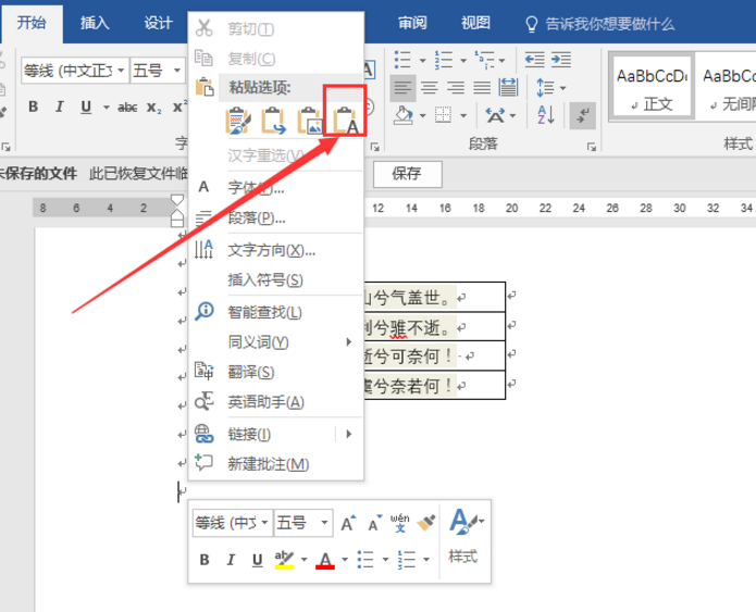 在日常办公中,我们会遇到将Word文档中数据内容提取出来的情况,用复制粘贴的方法虽然简单,但是遇到工作量大时就会浪费时间。今天小编就给大家介绍一种简便方法,让你快速提取Word中的数据。 如何提取Word表格中的内容? 1、打开Word文档,选择第一行的内容右键点击复制,在新的区域点击鼠标右键粘贴;  2、因为是逐个粘贴,文本自然没有边框,将表格中内容提取出来,需要重复多次,这个方法虽然简单,但如果内容较多就会浪费时间。  3、现在介绍简单的方法,当鼠标移动到表格区域时、在表格的左26. 爱人的离开有的时候其实是正确的选择,与其苟且着互相伤害,不如用残忍的伤害让你放手去寻找自己幸福。上角会出现一个符号,点击这个符号,点击之后整个表格都被选中;  4、选中表格之后点击右键选择复制,复制之后在新的区域选择鼠标右键,在弹出的菜单中选择最后一个粘贴,粘贴文本;  5、点击粘贴之后,表格中的所有内容都被提取出来,这样只要一个回合就可以完成之前多步的操作。粘贴为文本以后原来表格中的格式全部都被去除,如果需要原来表格的文字格式则需要重新设置,除此之外,当不再需要旧表格的时候,还要手动删除之前的旧表格。  6、另外再介绍一种一步到位的方法,保留原本文字格式的同时又去除表格框,而且不用再另外删除之前的旧表格,选择整个表格以后点击布局工具栏中的转换为文本,在弹出的对话框中点击确定;  7、相比较之前的方法更加方便快速,如此一个回合,word中的表格边框被删除,而且文字保持了原有样式。  按照以上方法,我们就可以快速提取Word文档中的数据内容,非常方便。 轻松提取word中内容,用这几种方法错落应有尽有豁达大度有致20. 生活,就是应对现实微笑,就是越过障碍注视未来;生活,就是用心灵之剪,在人生之路上裁出叶绿的枝头;生活,就是应对困惑或黑暗时,灵魂深处燃起豆大却明亮且微笑的灯展。54. He inspires me to major in English in college, to be a bridge between China and the world.(2016.北京)《庄子》84.吾生也有涯,而知也无涯。 定风波 柳永闻道玉门犹被遮,应将性命逐轻车。word,Word文档32、Out of sight, out of mind. |