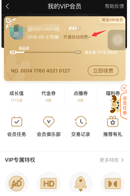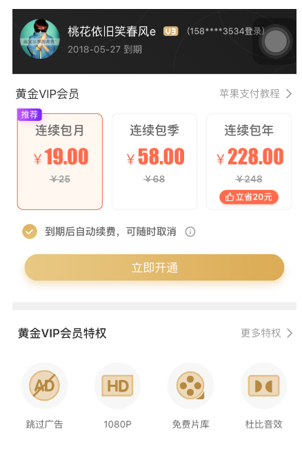 我们在爱奇艺中看视频时,发现很多影视剧只有会员才能观看,在开通爱奇艺会员之后,如果想续费应该怎么操作呢?下面小编就教你爱奇艺会员续费的方法! 爱奇艺会员怎么续费? 1、首先打开爱奇艺app,点击首页“我的”,进入个人中心。  2、然后点击“我的VIP会员”,上面也会显示会员到期时间。  3、然后可以看到“立即续费”按钮进行续费。  4、也可以在这里开通自动续费,这样就不用会员到期进行手动续费了。  5、点击“立即续费”之后,就可以进入续费页,43. 不爱时,再多的付出,再痛的牺牲,不过是让轻的更轻,重的更重。可以包月、包年等。当然价格是不一样的,然后点击立即开通就可以了。  开通爱奇艺会员续费功能,看剧不耽误花红欢天喜地风和日丽柳绿7. 黑夜落下了帷幕,天空还剩一丝残阳,最后的一抹,征兆黑暗即将称霸天空。远处的灯火,橘色地闪耀在每户人家家里。温暖总与灯光相称,徒留黑夜在悲伤里挣扎。introduce sb / sth to sb 向某人介绍某人 / 某事物(be) of help 有帮助的186.笔落惊风雨,诗成泣鬼神。《寄李十二白二十韵》 溶溶涧渌冰泮,醉梦里,年华暗换。料黛眉,重锁隋堤,芳心还动梁苑。劝君更尽一杯酒,西出阳关无故人。爱奇艺Although the popular belief is that…, a current (new / recent) study (survey / poll / investigation) indicates (shows / demonstrates) that… |