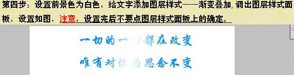流光字是现在非常流行的一种字体,经常被用于各大论坛当作个性签名来使用,流光字体的种类很多,有彩虹、流动、渐隐等等,非常漂亮。今天,小编就教大家用ps软件来制作闪闪发亮的流光字体,一起来学习下吧。 最终效果  如何用ps软件制作闪闪发亮的流光字体? 1、新建一个400 * 100像素的文档,背景选择白色,参数设置如下图。  2、设置前景色为细喜欢的颜色,这里设置为蓝色:#0091FC。 3、选择文字工具,在属性栏设置字体和字号,如下图,然后在画布上打上想要的文字。 杯茗之敬拼音:bēi míng zhī jìng释义:请人饮宴的谦辞。出处:《镜花缘》第十一回吴之和对唐敖、多九公道‘二位大贤由天朝至此,小子谊属地主,意欲略展杯茗之敬,少叙片时,不知可肯枉驾?’”示例:无 4、设置前景色为白色,给文字添加图层样式--渐变叠加。调成图层样式面板,设置如下图。注意设置完后不要点图层样式面板的确定。   如果图层样式面板挡住了画布,把画板移到一边,露出画布,鼠标放到画布上,按下鼠标左键不放,慢慢向左拖动,你发现了什么?对,流光在向左移动,好,继续向左拖动,知道看不见流光位置,现在点确定。 5、选择菜单:窗口 > 动画,调出动画面板(其它PS版本可直接点工具面板下面的IR进入IR操作),如果时间轴模式,点转换为帧模式按钮,转换为帧模式。  设置延迟为0.15秒,循环次数为永远,点击复制帧按钮,复制一帧。  选择帧2,在文字图层上双击渐变叠加,调出图层样式面板。  在画布上按下鼠标左键向右拖动,知道流光在字的右边消失为止,确定后。按住Shift 键不放,点击第一帧,把两个真都选中,点击过渡动画帧按钮,设置添加帧数为3,确定后。  点击播放按钮,查看一下效果。  6、选择菜单:文件 > 储存为Web和设备所用格式,格式为GIF。最后要提醒的是,在点击储存后,还会弹出一个警告框,如果用CS3一定要看清楚确定按钮在哪,如果点到取消文件将不会被保存。 如何用ps软件制作闪闪发亮的流光字体?顶天立飞蛾扑火云雾茫茫地人世沧桑,要为自己留一点空白,留一段风轻云淡的寂寞。寂寞可以让一个人脆弱,也可以使一个人坚强;寂寞可以造就一个人,也可以毁灭一个人。我很抱歉,明天我不能参加那场关于美国历史的演讲。243.君问归期未有期,巴山夜雨涨秋池。何当共剪西窗烛,却话巴山夜雨时。《夜雨寄北》 壁月初晴,黛云远淡,春事谁主?禁苑娇寒,湖堤倦暖,前度遽如许。香尘暗陌,华灯明昼,长是懒携去。谁知道、断烟禁夜,满城似愁风雨。今夜闻君琵琶语,如听仙乐耳暂明。Photoshop,流光字57、It six of one and half a dozen of the other. |