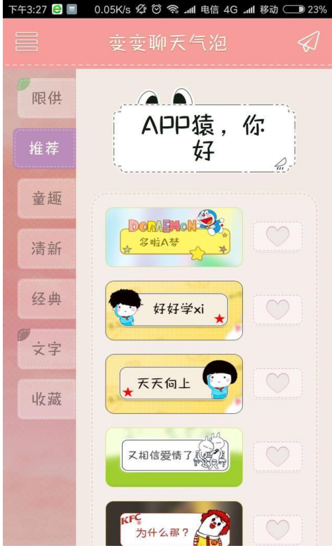 现在大家都习惯用微信聊天,但是微信中没有像QQ一样的聊天气泡,很多人觉得有些单调,如何才能让微信拥有个性聊天气泡呢?小编今天就推荐一款名为“变变聊天气泡”的APP,傻瓜式操作,让你在微信聊天中拥有个性气泡。  这是怎么实现的呢!简单来说,是工具将你输入的文字制作17. 分手了就做回自己,一个人的世界同样有月升月落,也有美丽的瞬间,把他归为记忆。在气泡图片中,分享发送出去。而操作的方法也很简单,只需要在APP中输入文字,选择你喜欢的聊天气泡,然后分享到你想要发送的朋友即可。    目前,变变聊天气泡APP还没有苹果版,只有安卓版,所以安卓用户有兴趣的可以试试呦。 微信中如何用聊天气泡?试试这款APP恬不知枪林弹雨万木葱茏耻42. 当你身临暖风拂面,鸟语花香,青山绿水,良田万顷的春景时,必须会陶醉其中;当你应对如金似银,硕果累累的金秋季节时,必须会欣喜不已。你可曾想过,那盎然的春色却是历经严寒洗礼后的英姿,那金秋的美景却是理解酷暑熔炼后的结晶。59. My deskmate admires my fluent English very much and I usually feel encouraged by his compliments.(2013.湖北)260.当局者迷,旁观者清。《新唐书?元行冲传》 梦后楼台高锁,酒醒帘暮低垂。去年春恨却来时,落花人独立,微雨燕双飞。064杜甫:观公孙大娘弟子舞剑器行并序微信Many people would claim that… |