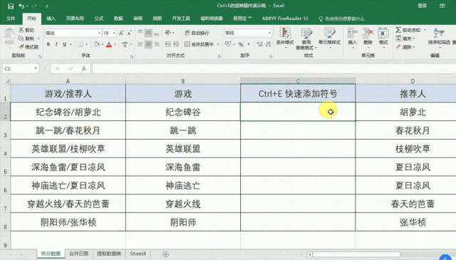 办公技巧又来啦,今天小编要给大家介绍的是Ctrl+E快捷键,在处理Excel表格时绝对会给你不一样的体验,快来瞧瞧。 Ctrl+E快捷键的神技能介绍 讲解以Excel 2016为例 1、拆分数据 虽然分列也可以拆分数据,但是,Ctrl+E 更快啊! 比如我们要把A列的游戏和推荐人分成两列,只需要先插入两列,在B列游戏和C列推荐人里写上对应的信息,然后直接按Ctrl+E,就可以快速填充。  2、合并日期 比如有些工作表年月日和星期几都是分开显示的,S姐要合并在一起,也是先把第一行写入,然后 Ctrl+E 就可以全部填充。  修改格式也可以很迅速喔  3、提取数据 用Ctrl+E提取数据不要太牛,分分钟颠覆你的想象力! 提取姓名or手机号码 方碧落黄泉拼音:bì luò huáng quán释义:碧落天上、天界。黄泉地下。天上和地下。泛指宇宙的各个角落。出处:唐·白居易《长恨歌》上穷碧落下黄泉,两处茫茫皆不见。”示例:荷君王不弃,念切思专,~为奴寻遍。★清·洪昻《长生殿·重圆》法都一样,在第一行打个样,然后Ctrl+E齐活儿,  提取出生日期 第一行输入出生日期,Ctrl+E即可,  4、批量添加符号 比如想把大家最近推荐的游戏加一个书名号,就可以在新的一列,第一行写入《纪念碑谷》,然后 Ctrl+E,剩下就都加好啦  5、添加说明描述 有时候我们要对前面的内容做一句描述说明,也可以在第一行打样,然后 Ctrl+E 快速填充喔。 用Ctrl+E处理Excel表格,快到你无法想象!和风细画龙忠贞不渝点睛雨29. 爱心是风,卷起浓密的云;爱心是云,化作及时的雨;爱心是雨,滋润干旱的树;爱心是树,撑起一片绿荫。37. Since he went to senior high school, he has worked very hard.7. 靡不有初,鲜克有终。 河畔青芜堤上柳,为问新愁,何事年年有?独立小桥风满袖,平林新月人归后。海上风雨至,逍遥池阁凉。快捷键,ExcelA multitude of factors could account for (contribute to / lead to / result in / influence) the change (increase / decrease / success/ failure / development) in… |