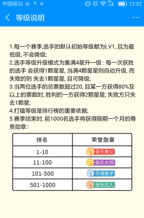 手机中下载了酷狗音乐APP,很多人只是用来听歌,其实不然,在酷狗中可以K歌、打擂,如果你感觉自己唱歌不错,可以跟人家打擂台哦。下面是小编整理的酷狗音乐打擂秘籍,快收! 酷狗音乐怎么打擂? 1、打开酷狗音乐APP,点击右上角“唱”进入唱版块,找到“蒙面排位赛”,可以看到当前正在参与打擂的人数。  2、进入“蒙面排位赛”版块,可以看到本期全部30首打擂歌曲(每天晚18:00-第二天17:00为一期,每期30首歌曲)选择自己想唱的一首,点击“打擂”即可(每期只能选一首歌曲打擂,打过擂的,看到的“打擂”按钮即为灰色)  3、点击“打擂歌曲”下方“打擂歌单预告”,可查看下期30首打擂歌曲,也可提前练习准备。  4、打擂就和平时自己唱歌录音一样,顶部会多一个“打擂中”的提示。唱完整首歌曲,点击保存(系统也会自动保存),再点击底部“上传”按钮即可。上传成功系统会提示:第二天18:00出打擂结果。然后你就可以去听自己刚刚唱的歌并看下和自己PK的对手是谁。  5、在“对阵”列表,可以看到和你PK的对手、双方票数、支持你的评委等,也可以去听下对手唱得怎么样  6、点击评委区,可以看到所有支持你的大众评委,可以逐一点进去查看他们的资料、听他们的歌曲、为他们点赞/评论,也可以统一“答谢评委”。  7、在“对阵”列表,点击右上角“分享”按钮,即可把你的战绩分享给好友,并邀请好友投票(最多3票)。  8、点击“我的战绩”,可查看个人所有打过的及正在进行中的擂台赛。  9、右上角“等级说垂涎三尺拼音:chuí xián sān chǐ释义:涎口水。口水挂下三尺长。形容极其贪婪的样子。也形容非常眼热。出处:老舍《赵子曰》第三章对面坐着一个垂涎三尺的小黑白花狗,挤眉弄眼的希望吃些白薯须子和皮。”示例:无明”按钮,点击可查看打擂晋级、加分及等级说明。  10、进入“等级说明”页面,可查看账号升级、降级、荣誉勋章等打擂规则说明。 酷狗新玩法:够胆就来打擂台!百霜林尽染雍容华贵花齐放26. 有一天还是要面对分离,对面这情深缘浅的现实;有一天我们会分道扬镳,变成了最熟悉的陌生人。感谢你的体谅。欧阳修278.忧劳可以兴国,逸豫可以亡身,自然之理也。《伶官传序》 晓色云开,春随人意,骤雨才过还晴。古台芳榭,飞燕蹴红英。舞困榆钱自落,秋千外、绿水桥平。东风里,朱门映柳,低按小秦筝。山石荦确行径微,黄昏到寺蝙蝠飞。酷狗,酷狗音乐34、Difficult the first time, easy the second. |